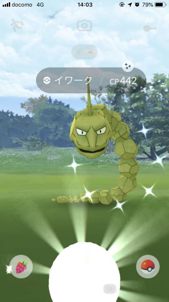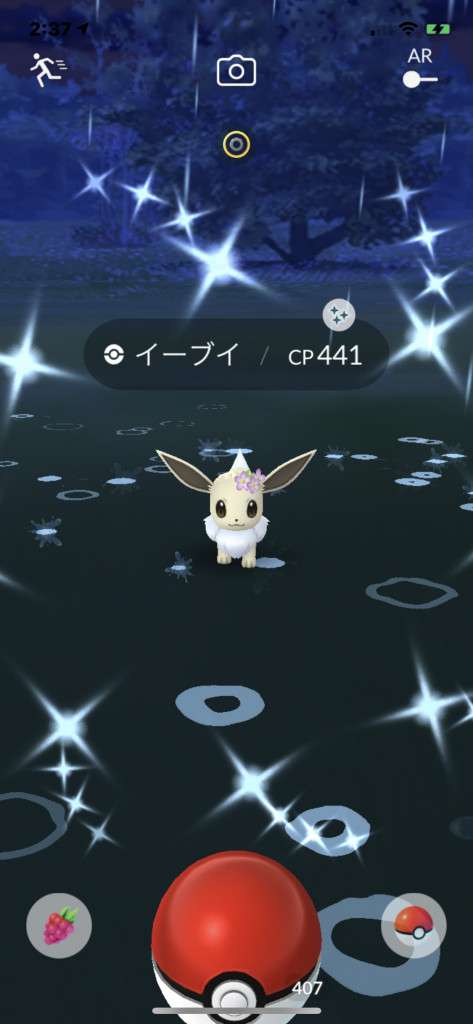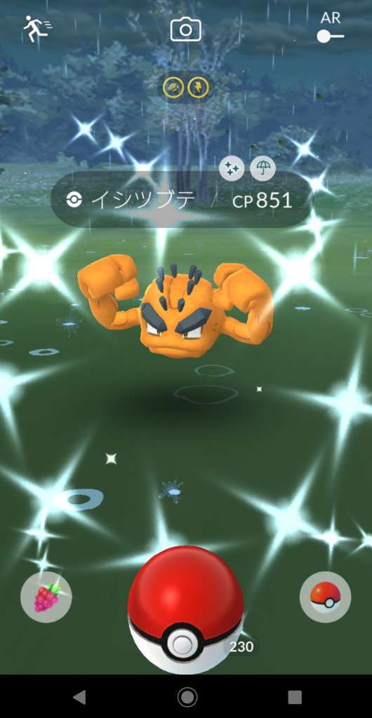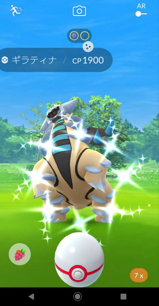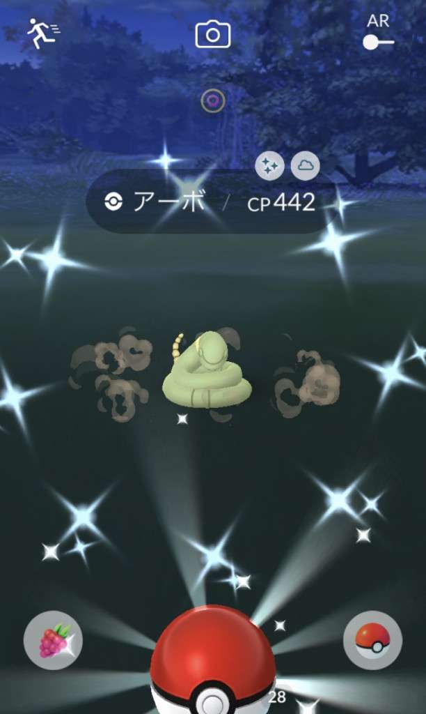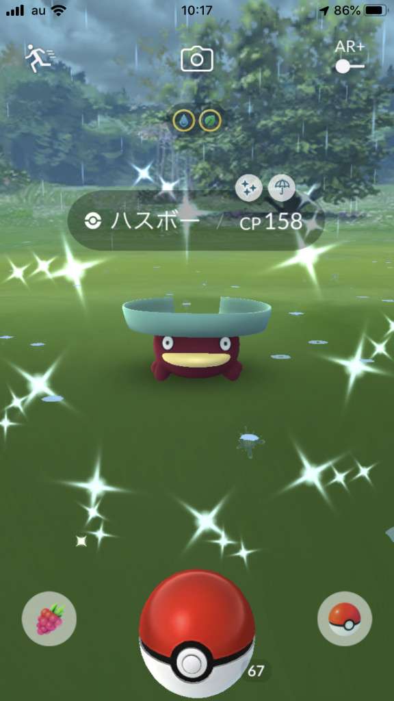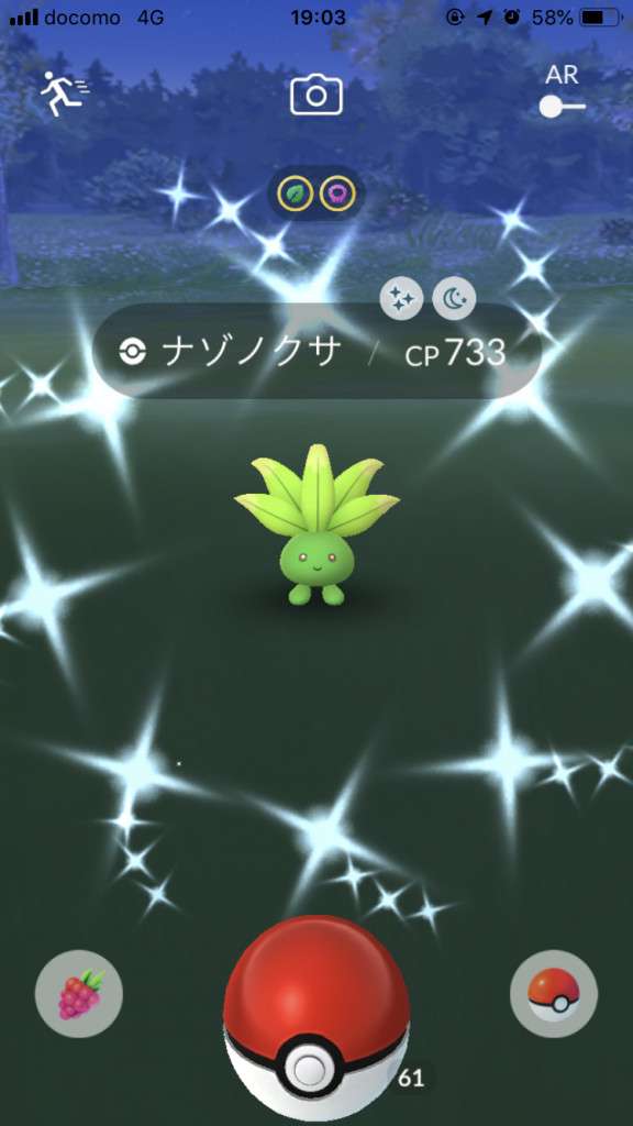 ・色違い出現したら、右上「AR+」のON・OFF切り替えで、タイミング良く写るまで何回も挑戦