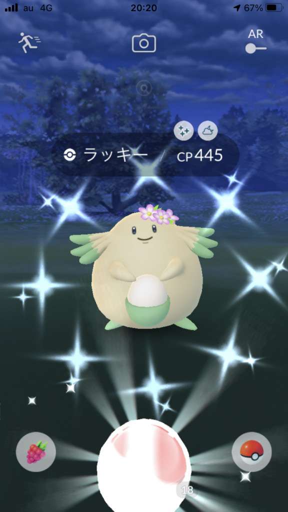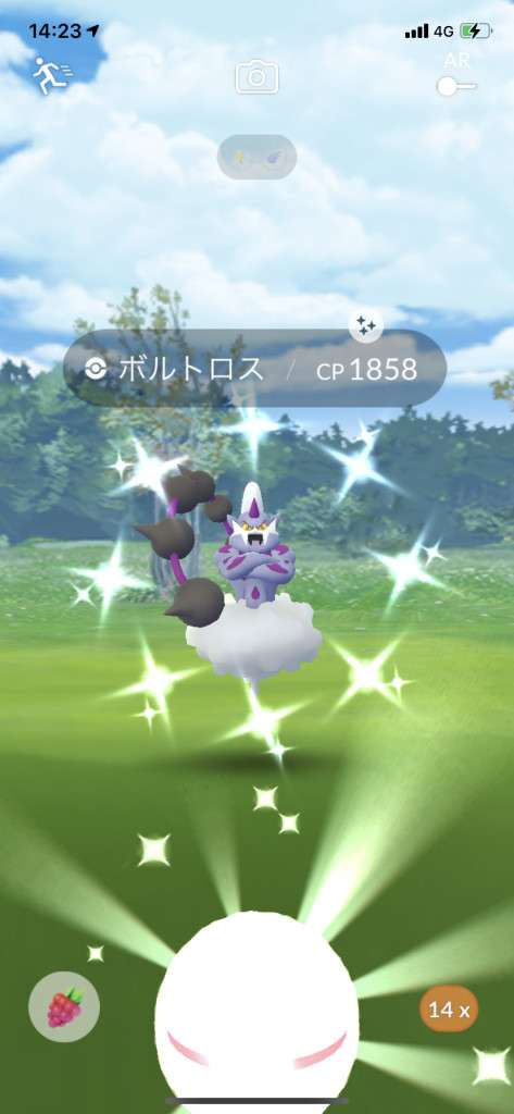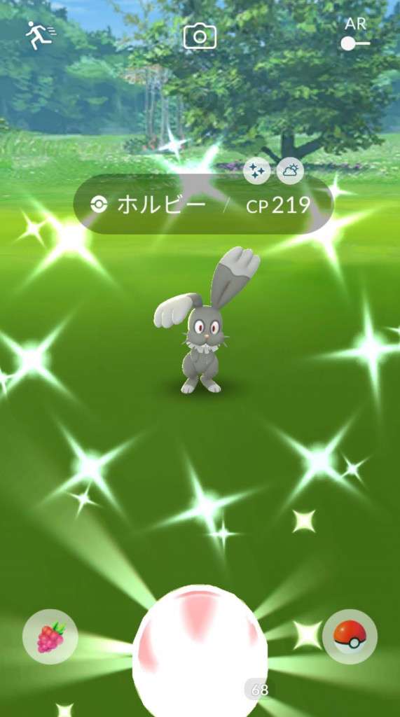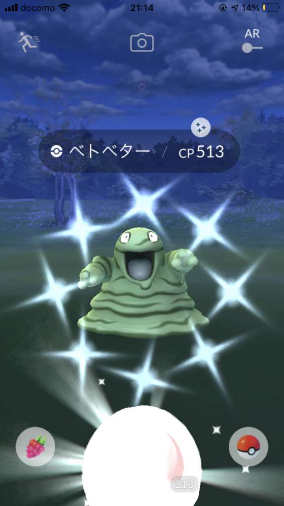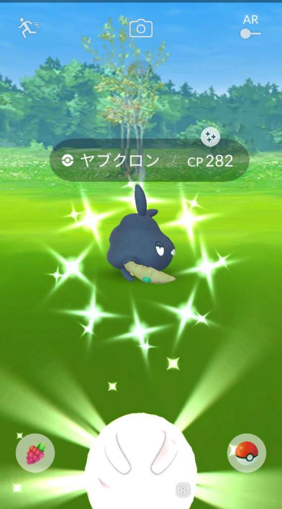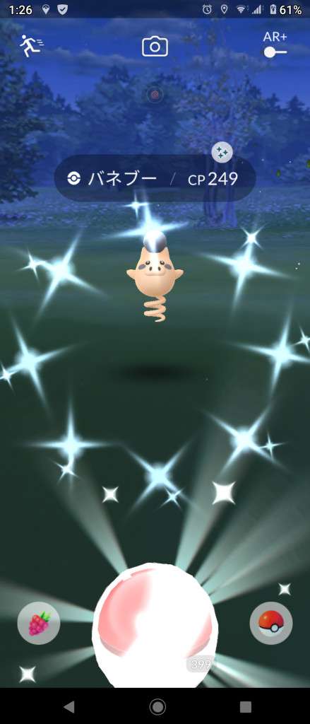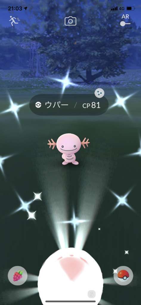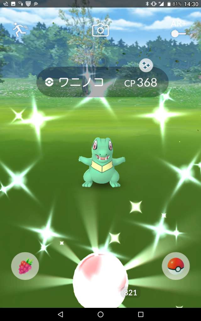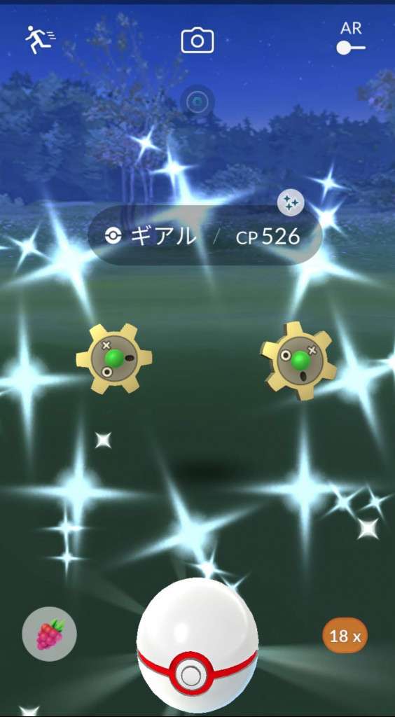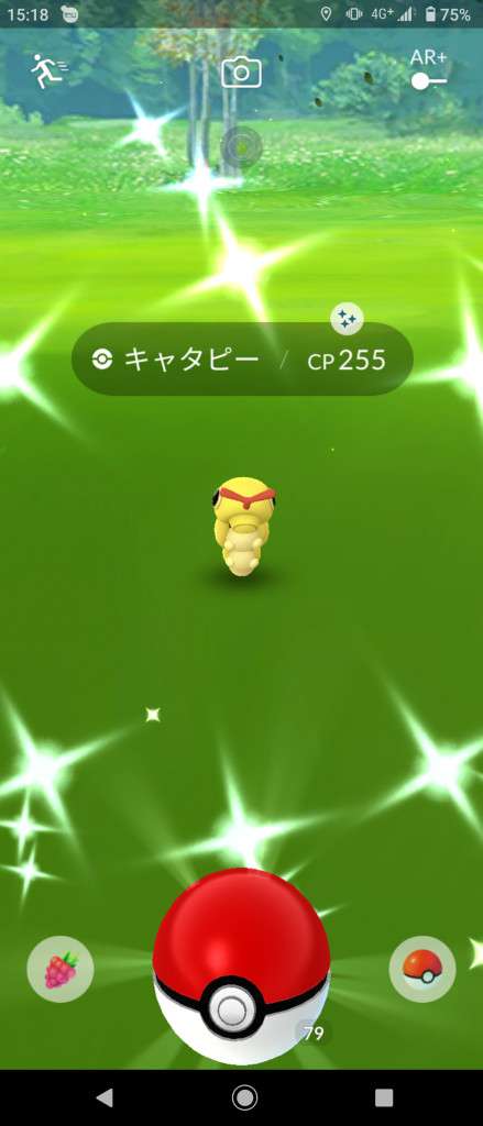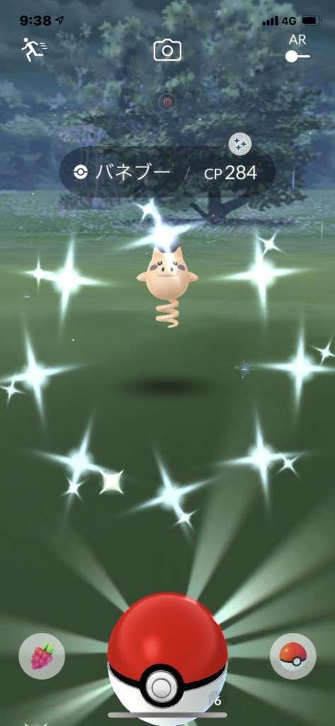・色違い出現したら、右上「AR+」のON・OFF切り替えで、タイミング良く写るまで何回も挑戦