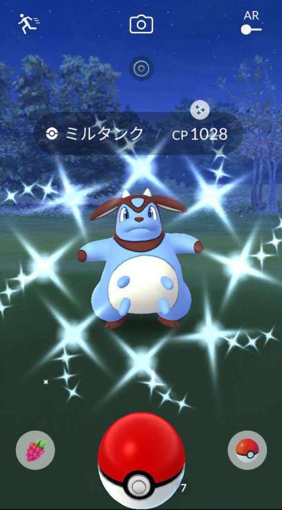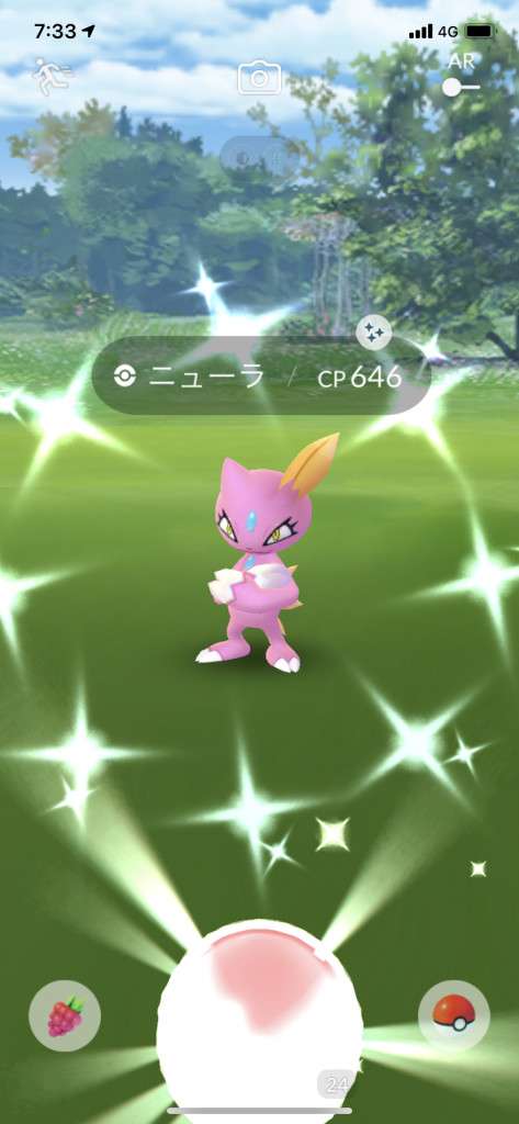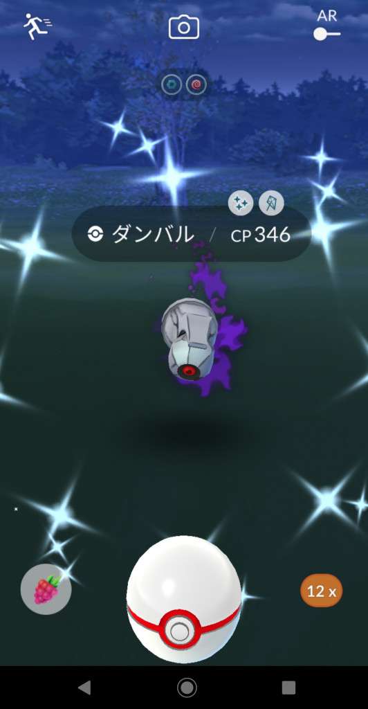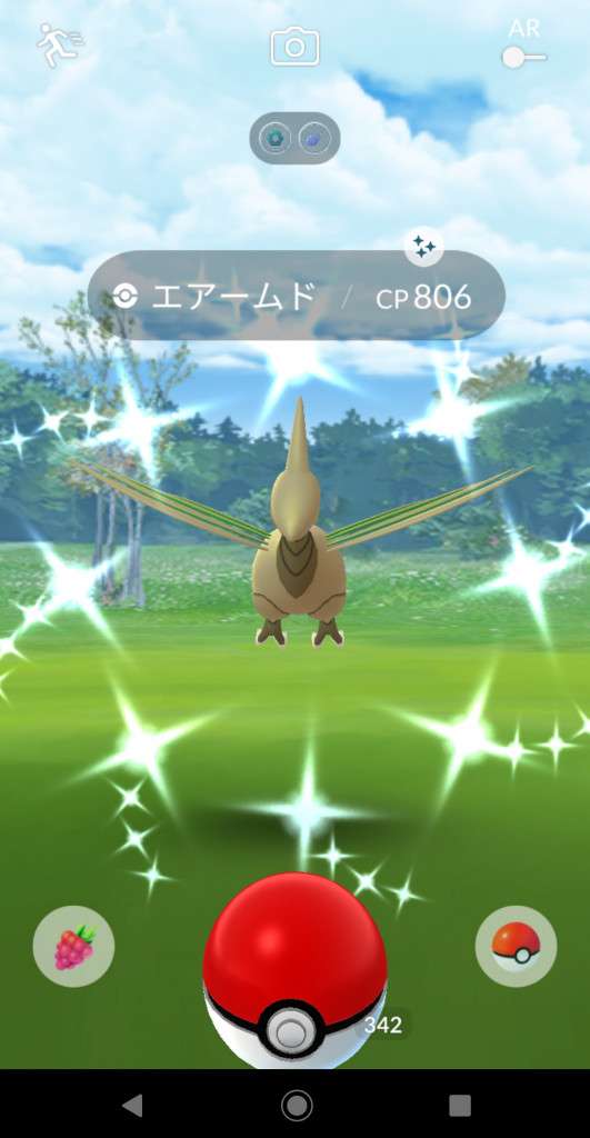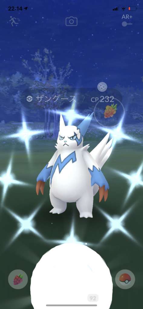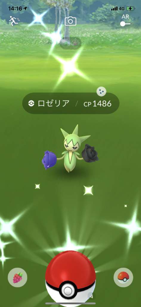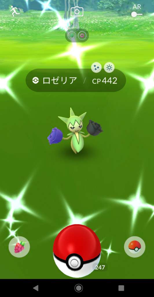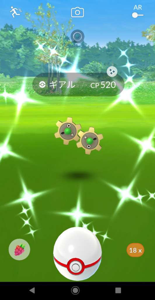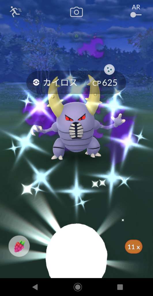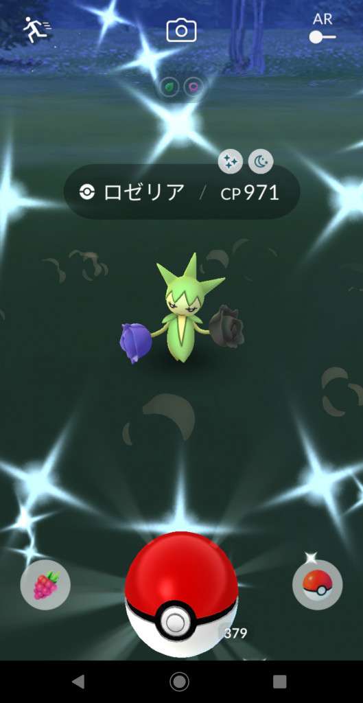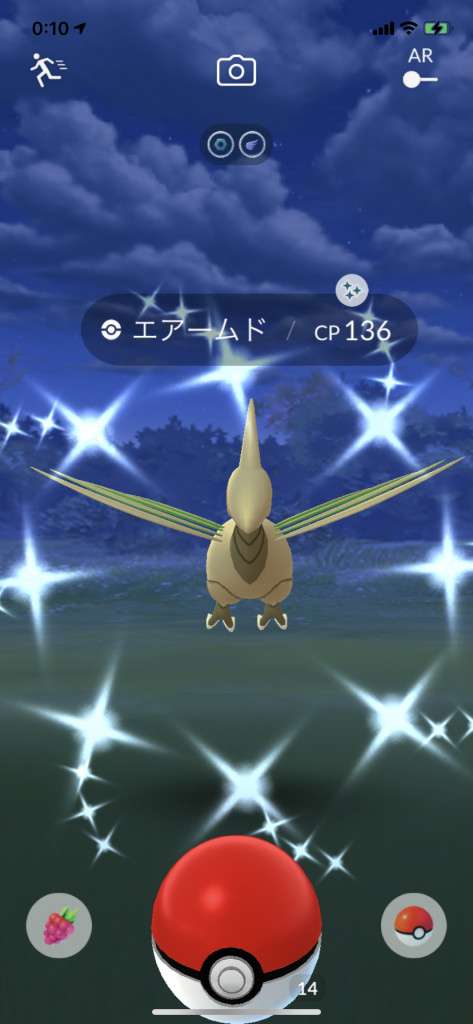 ・色違い出現したら、右上「AR+」のON・OFF切り替えで、タイミング良く写るまで何回も挑戦