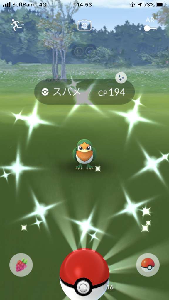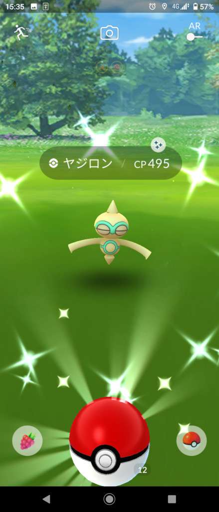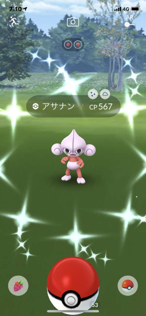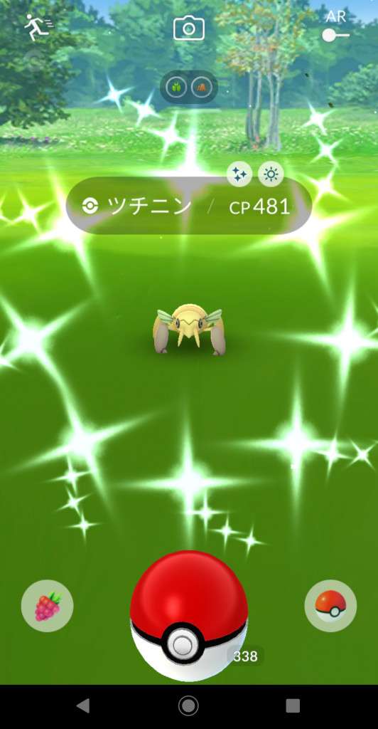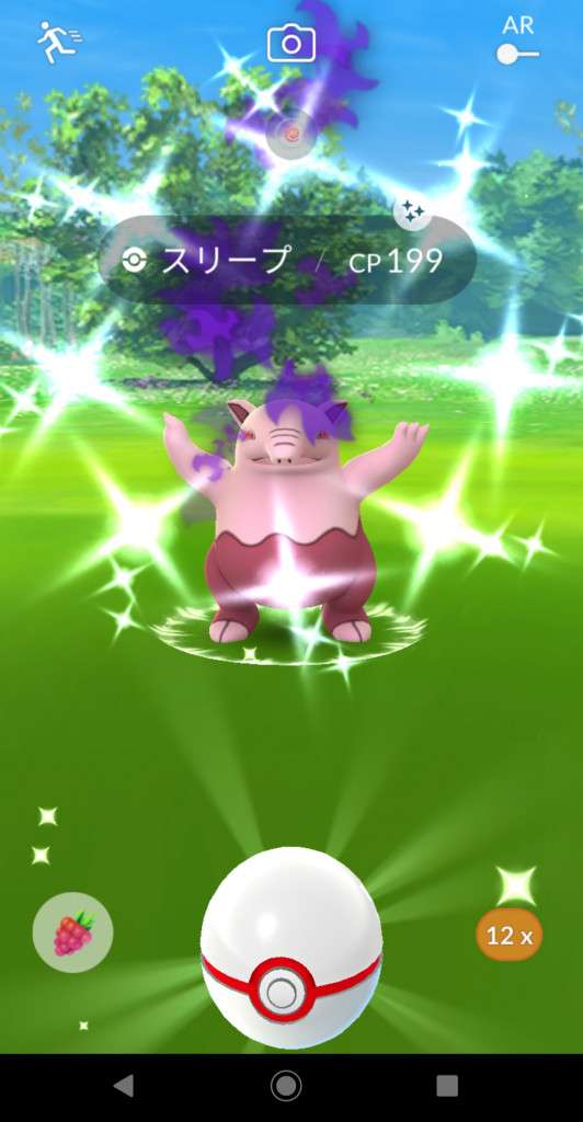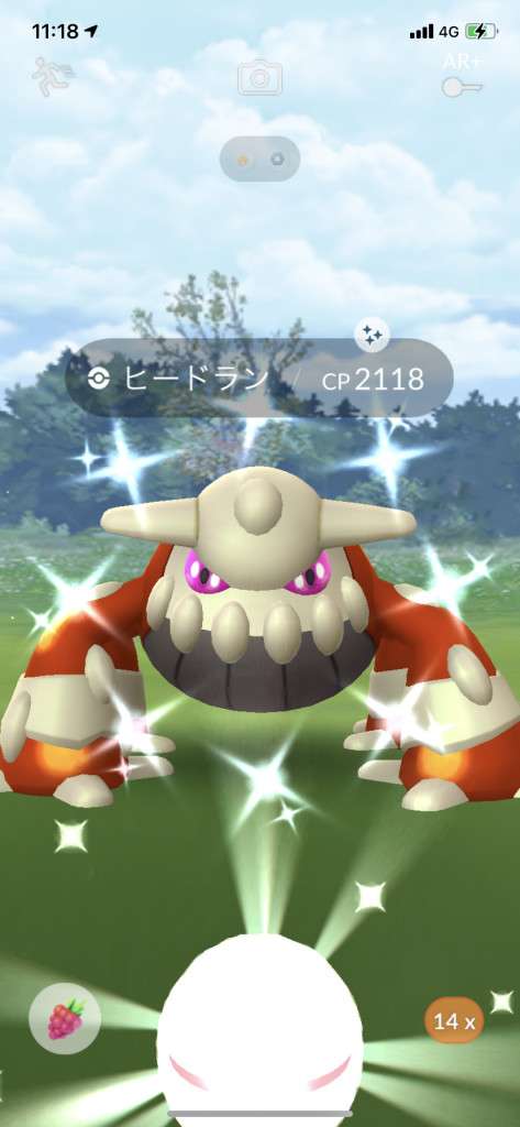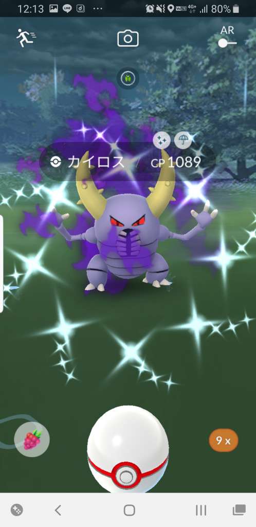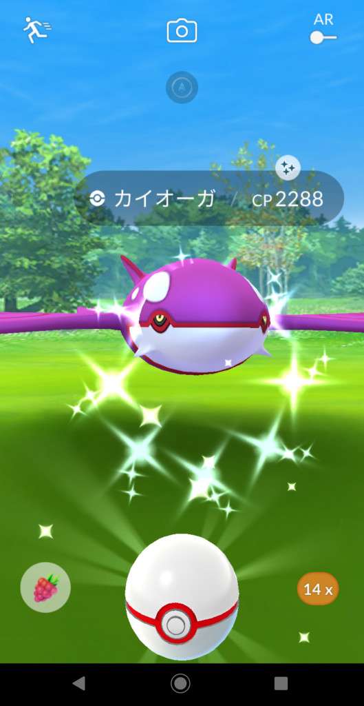 ・色違い出現したら、右上「AR+」のON・OFF切り替えで、タイミング良く写るまで何回も挑戦