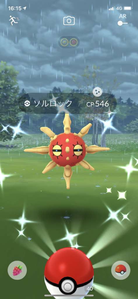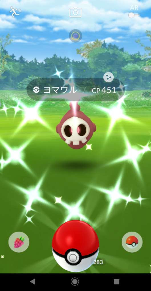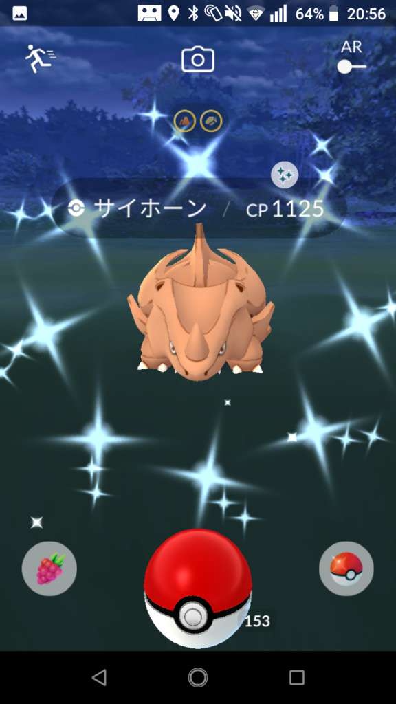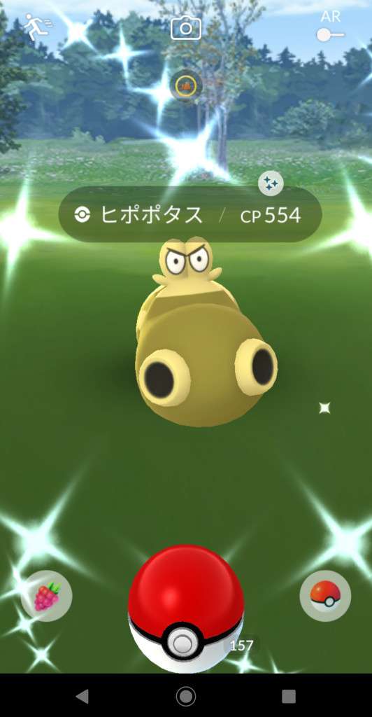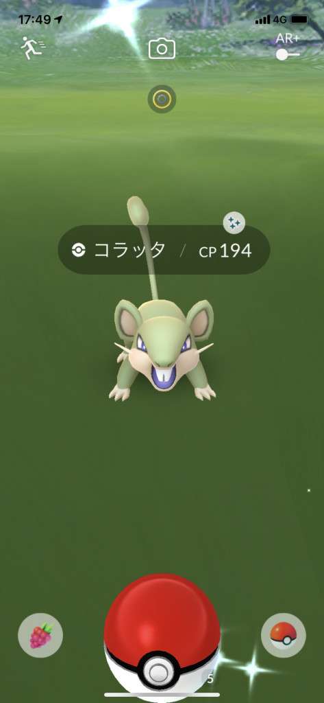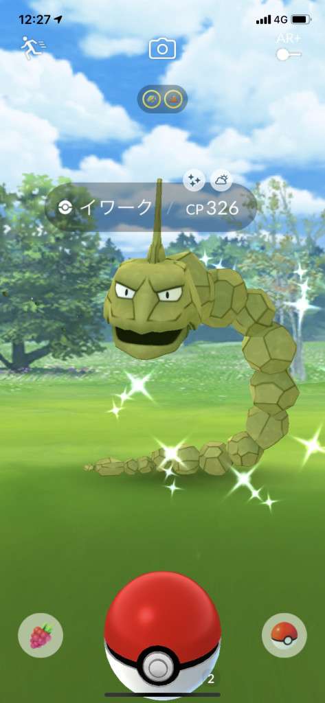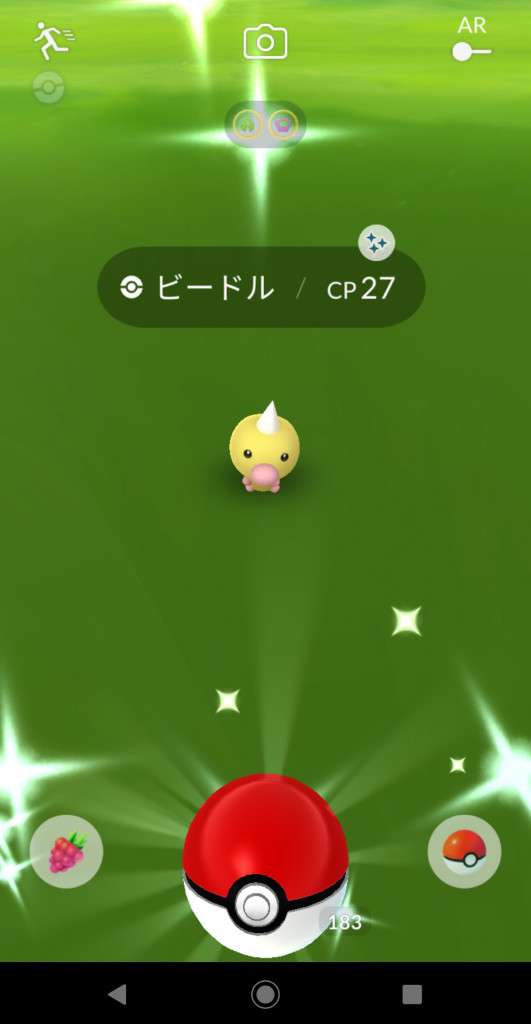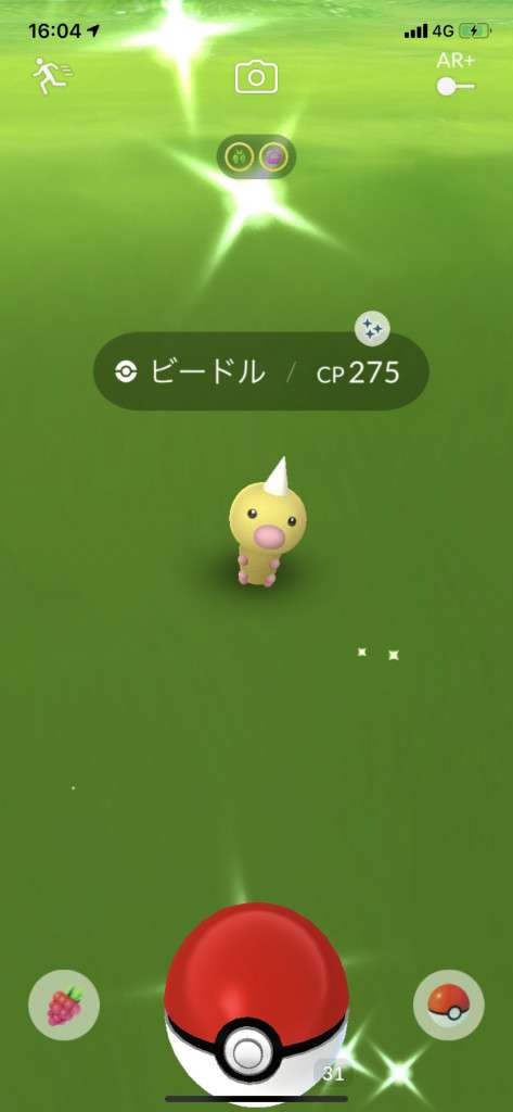 ・色違い出現したら、右上「AR+」のON・OFF切り替えで、タイミング良く写るまで何回も挑戦