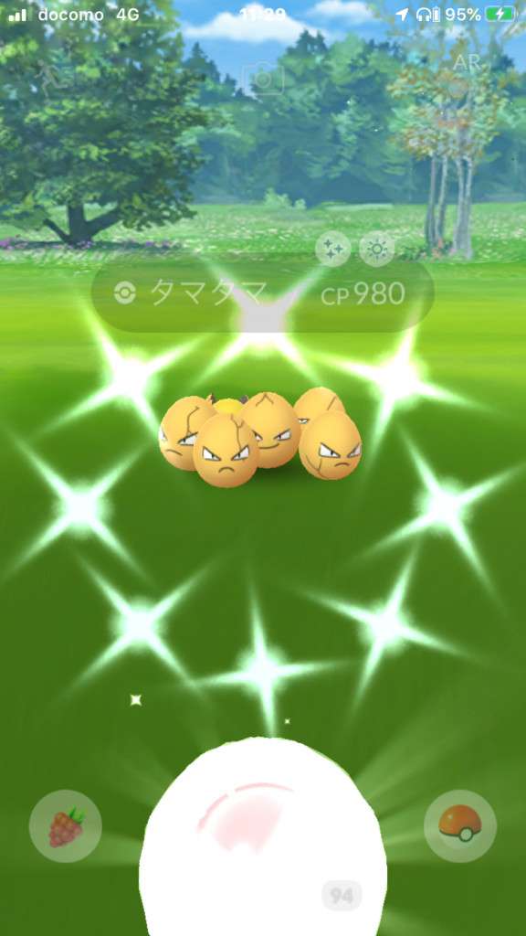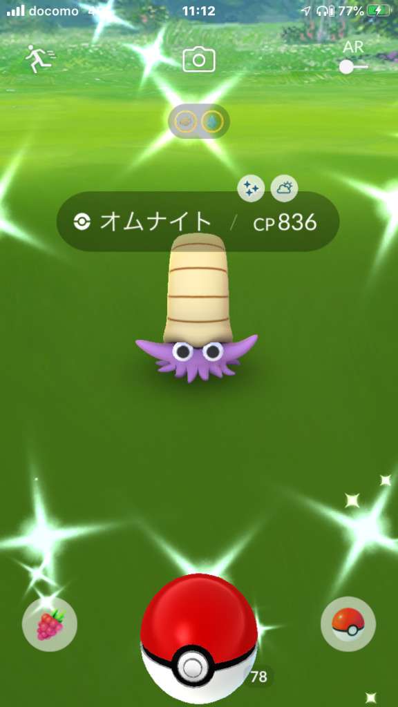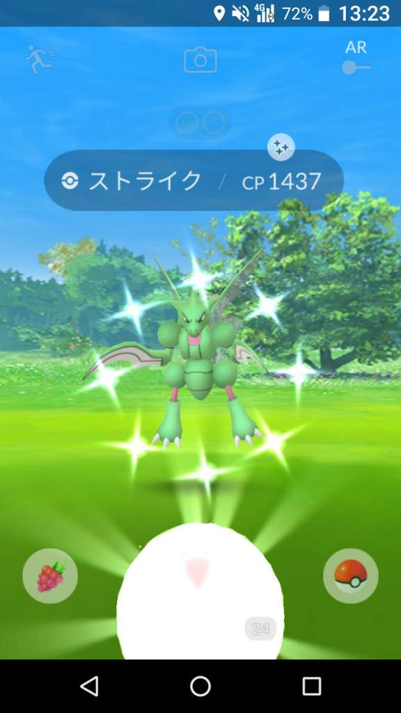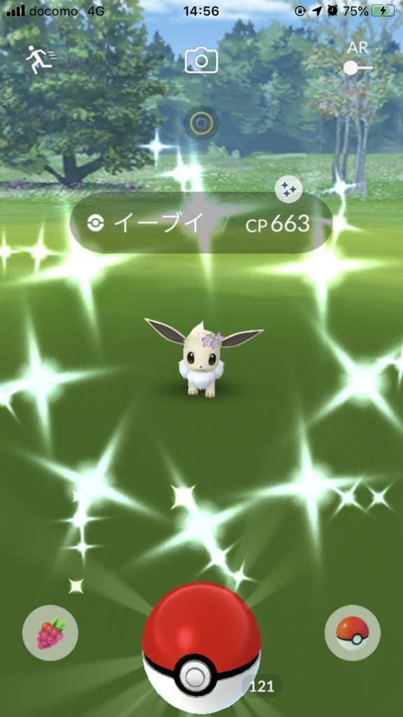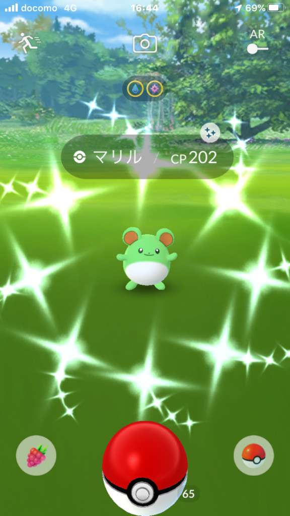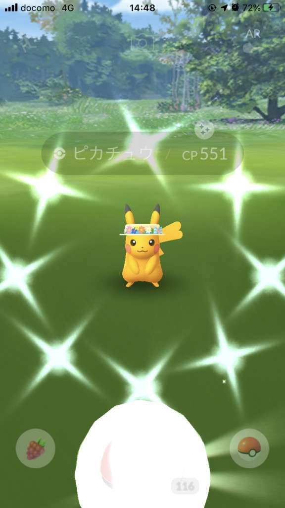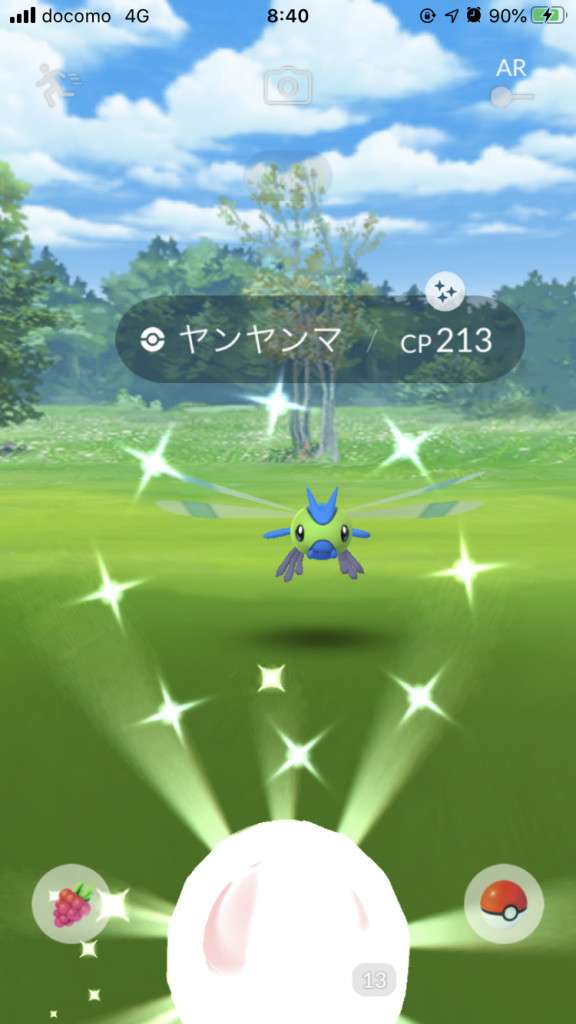 ・色違い出現したら、右上「AR+」のON・OFF切り替えで、タイミング良く写るまで何回も挑戦