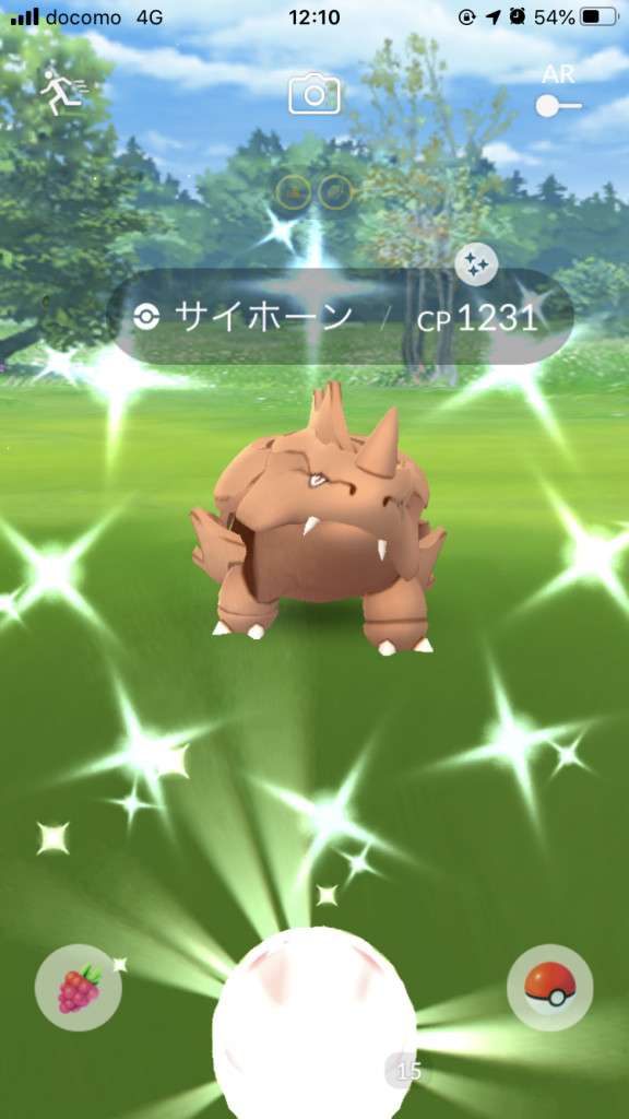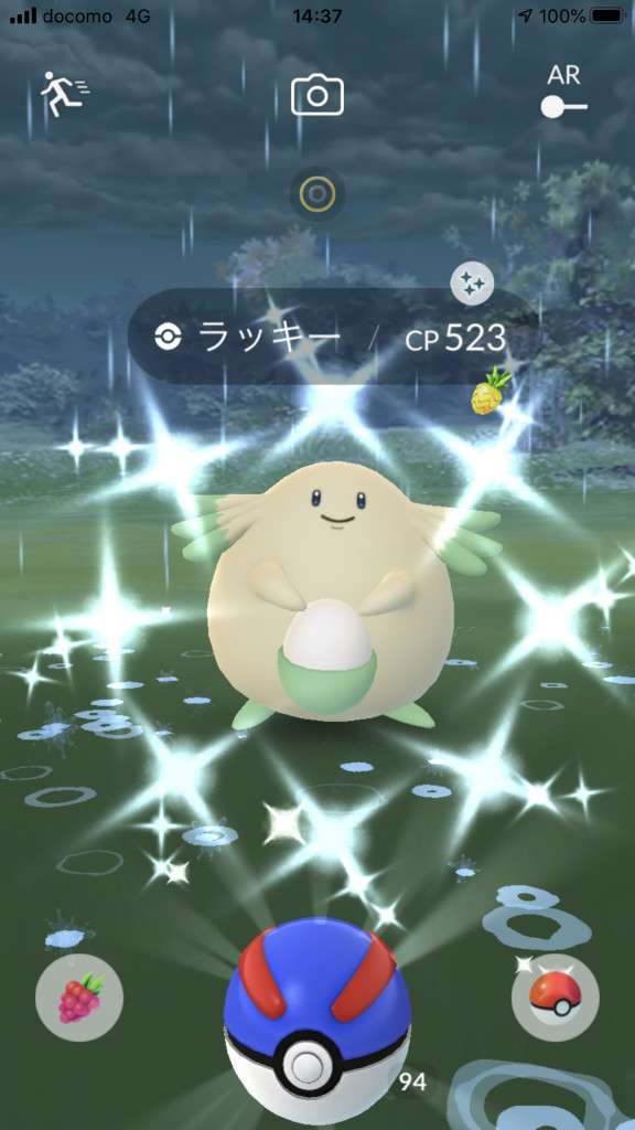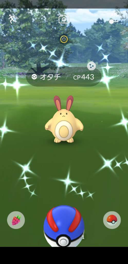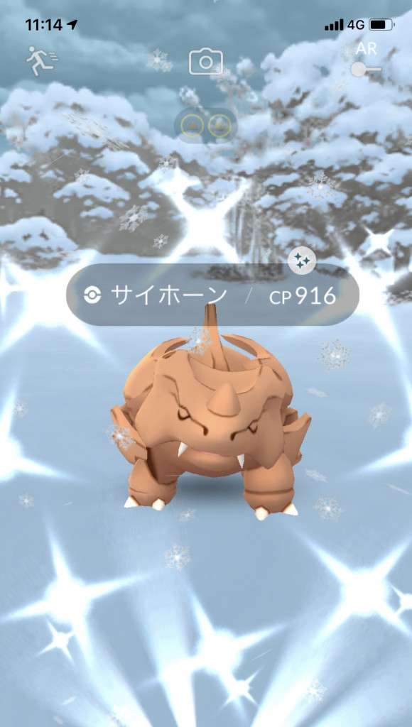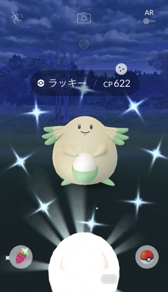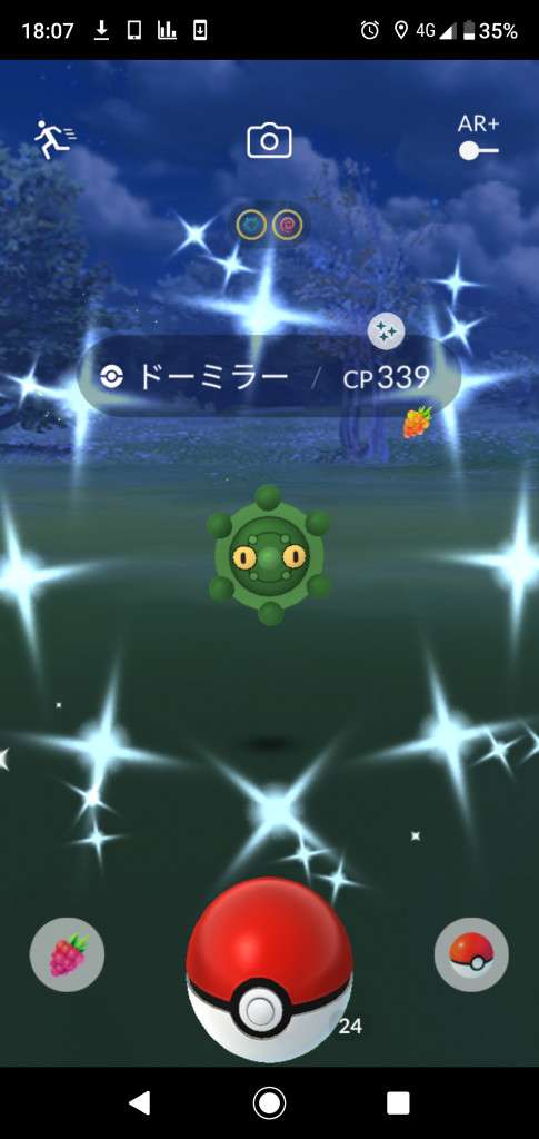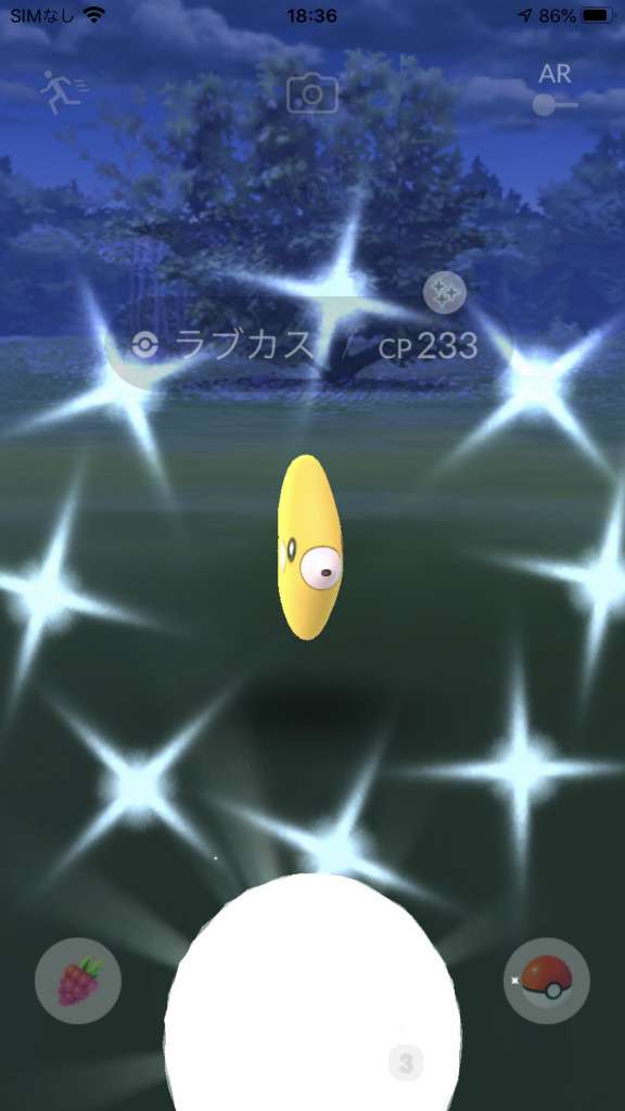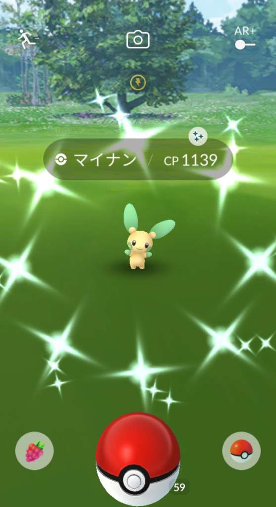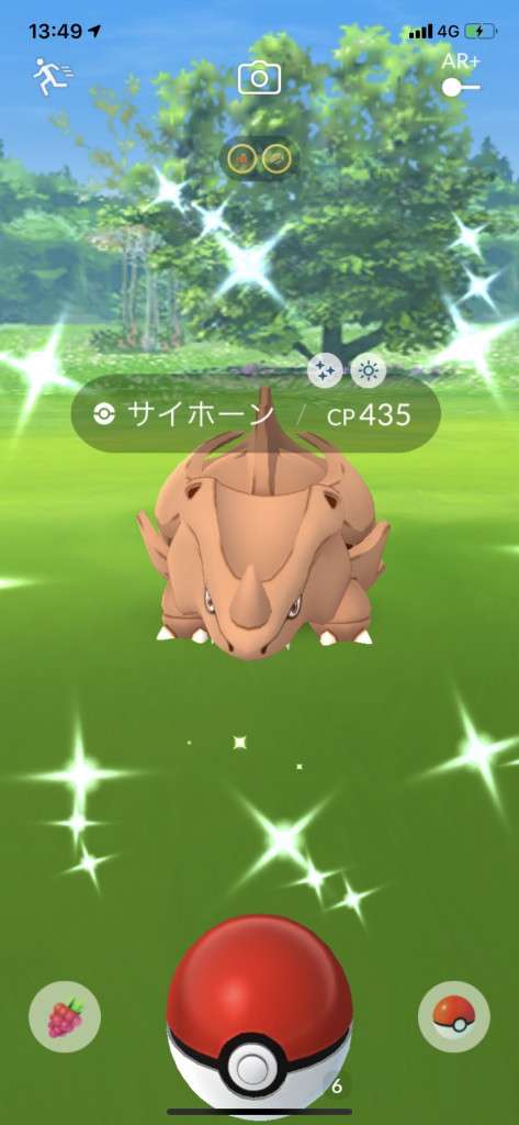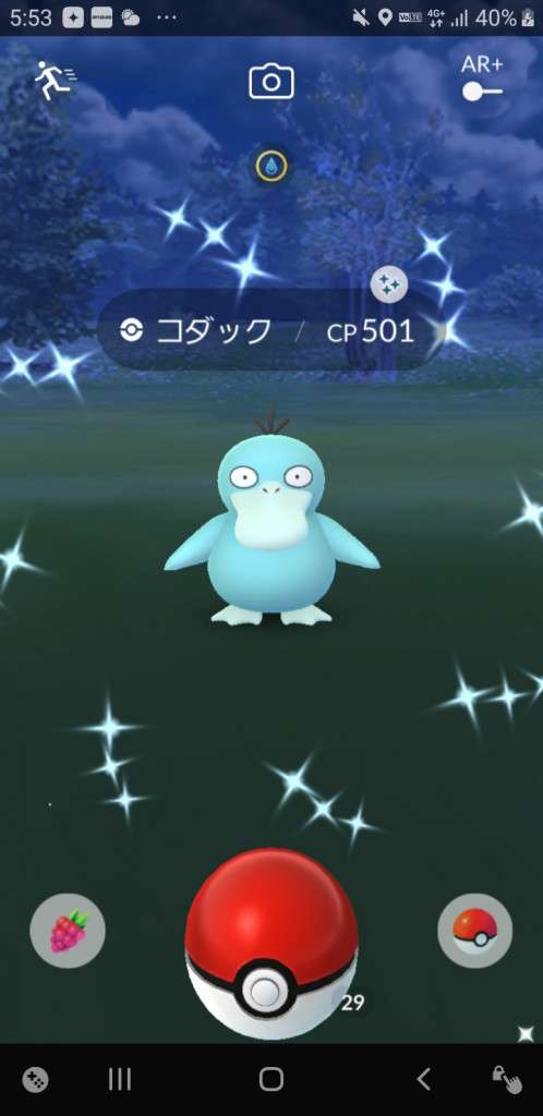 ・色違い出現したら、右上「AR+」のON・OFF切り替えで、タイミング良く写るまで何回も挑戦