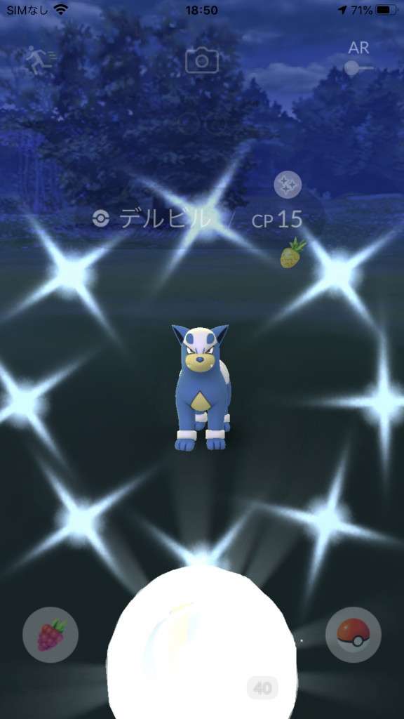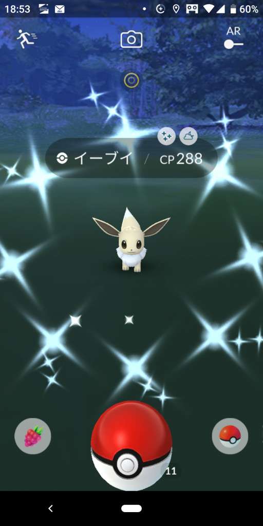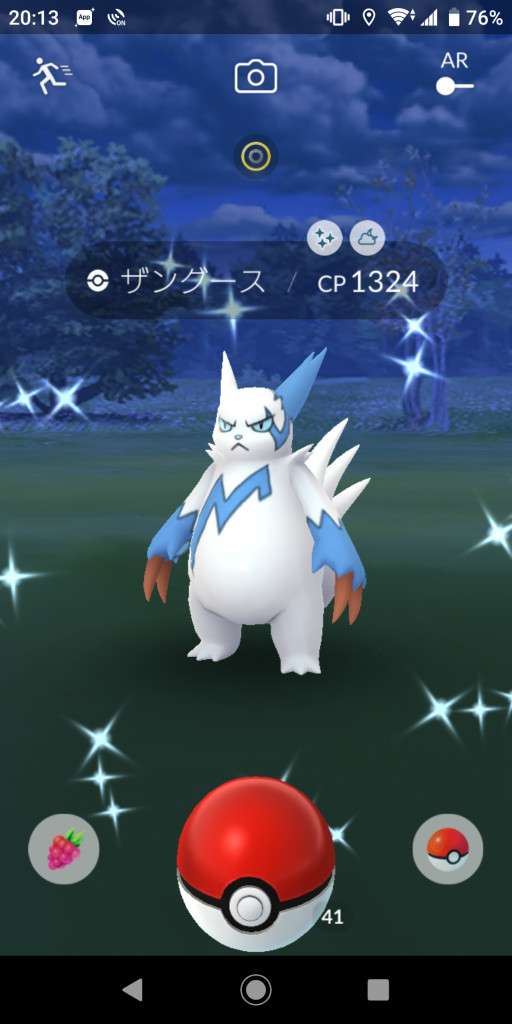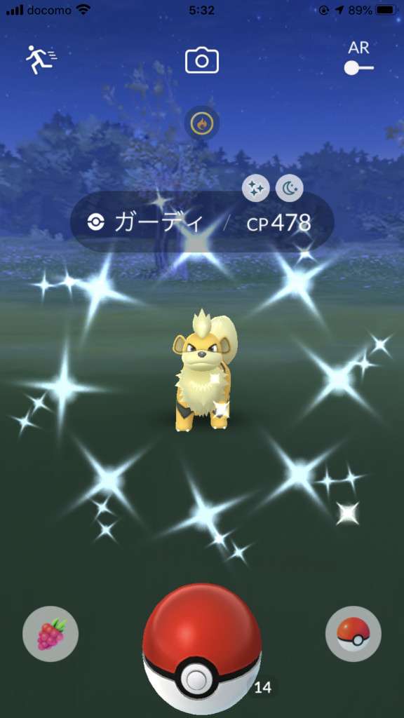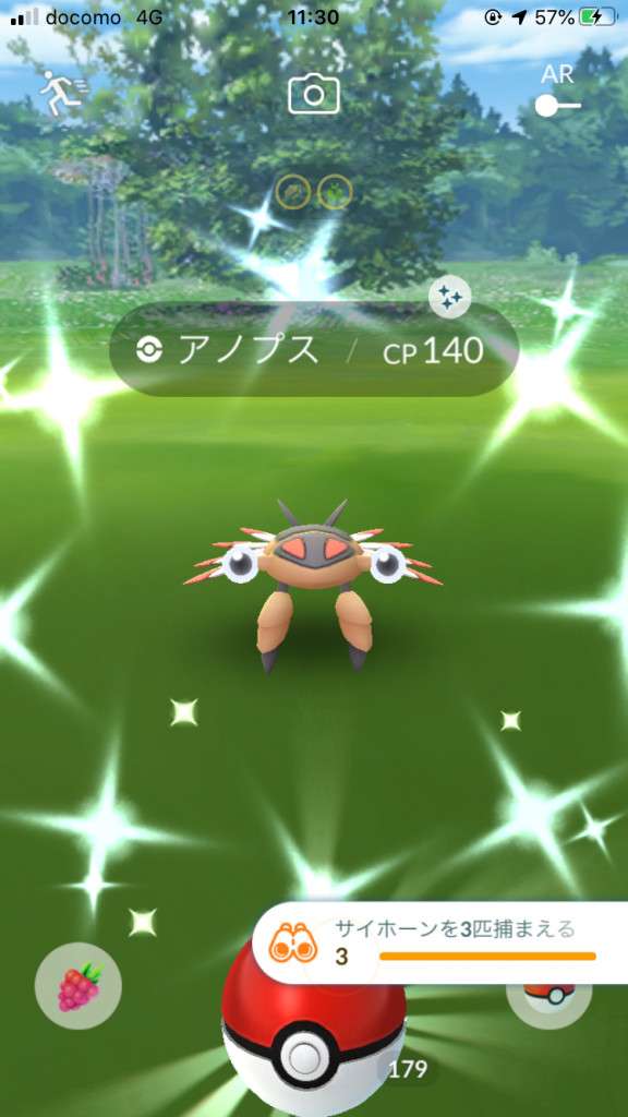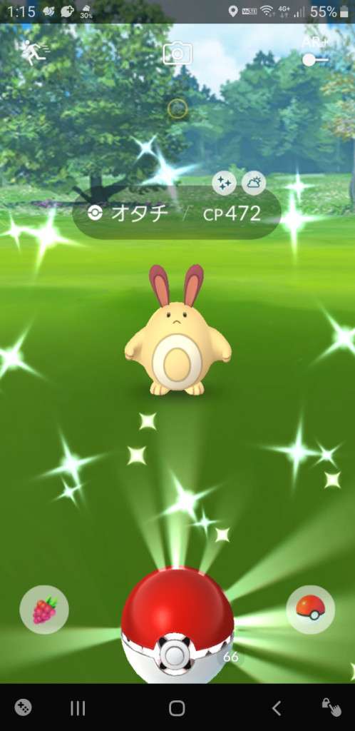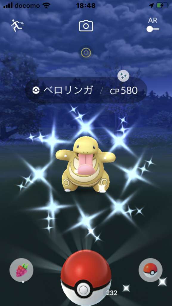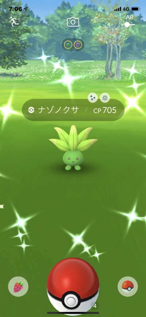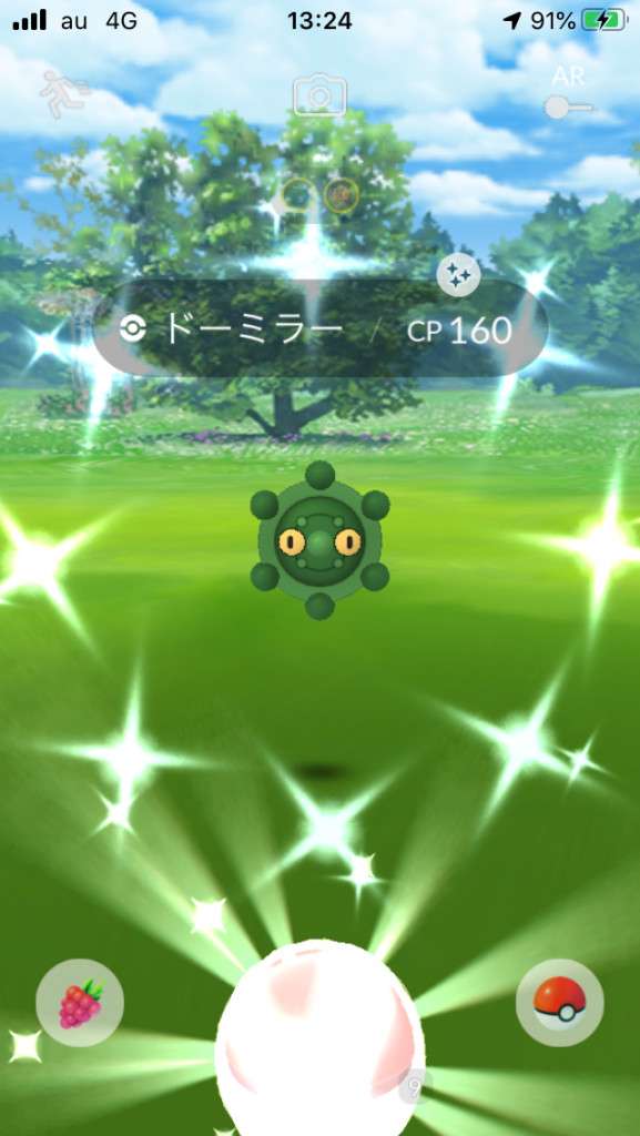 ・色違い出現したら、右上「AR+」のON・OFF切り替えで、タイミング良く写るまで何回も挑戦