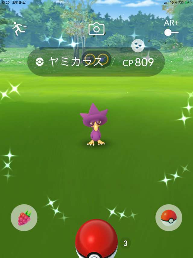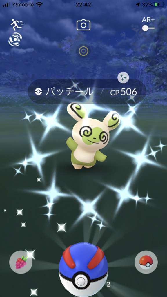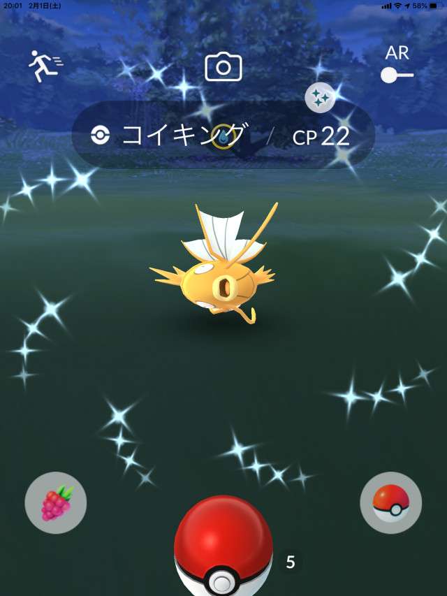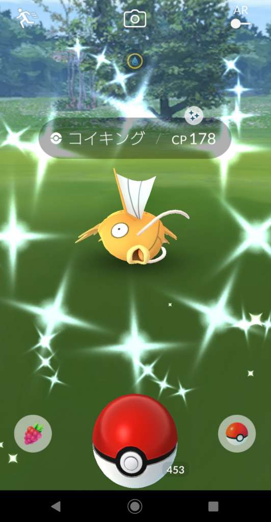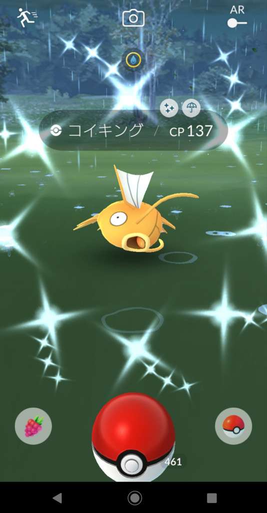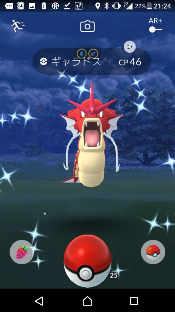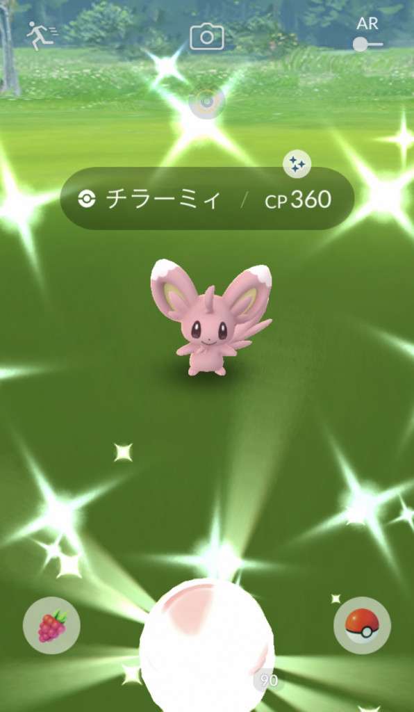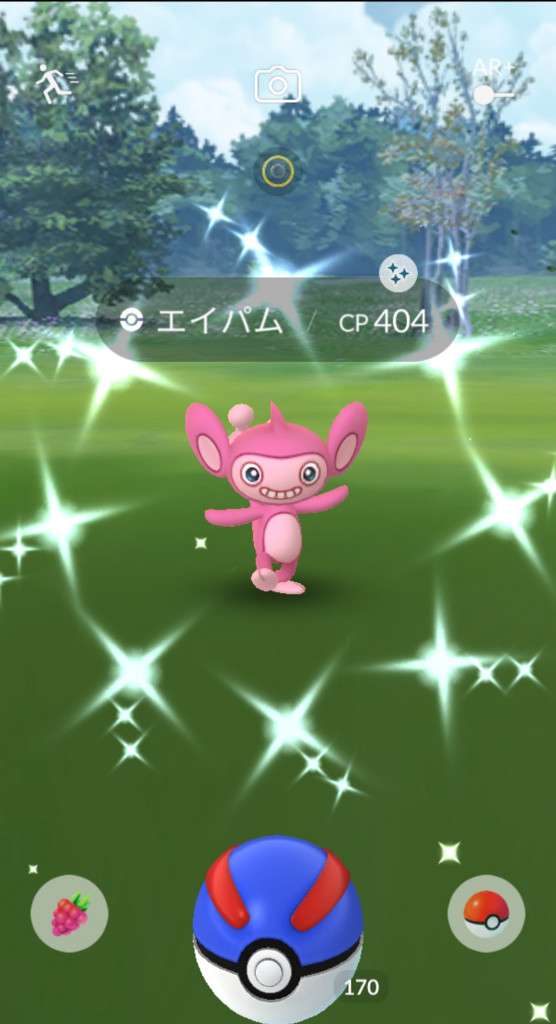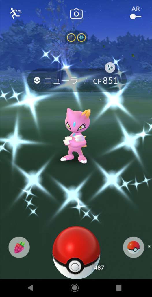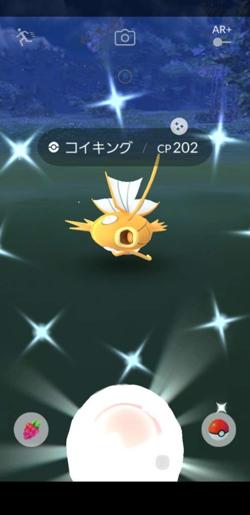 ・色違い出現したら、右上「AR+」のON・OFF切り替えで、タイミング良く写るまで何回も挑戦