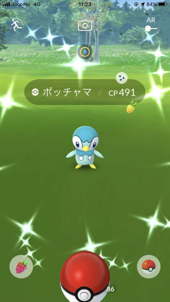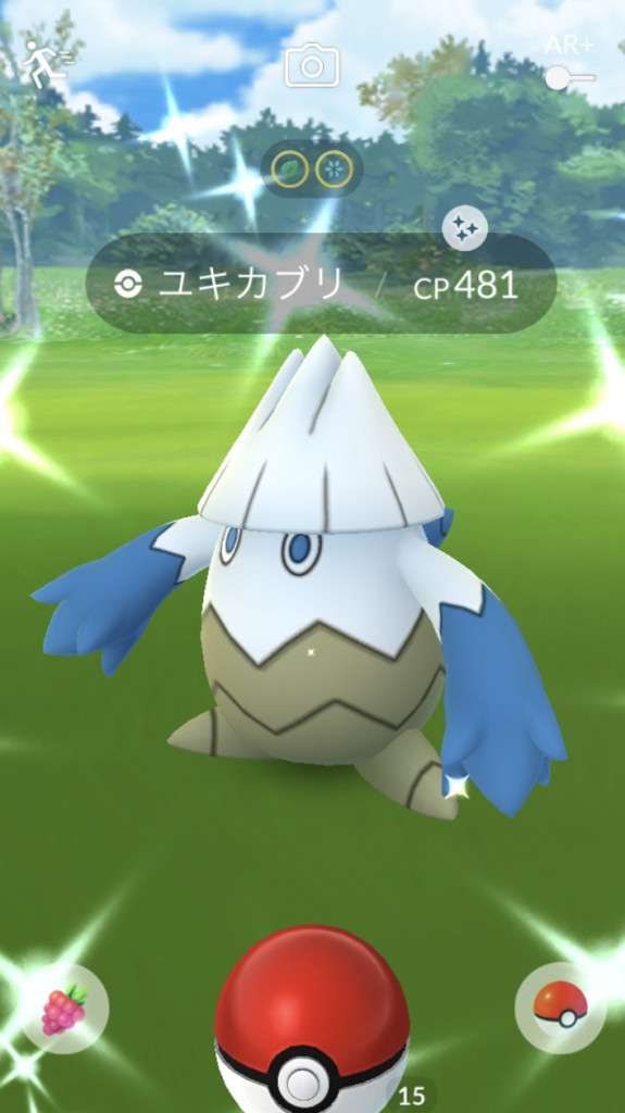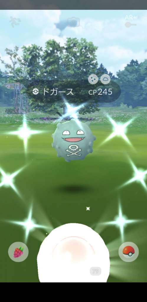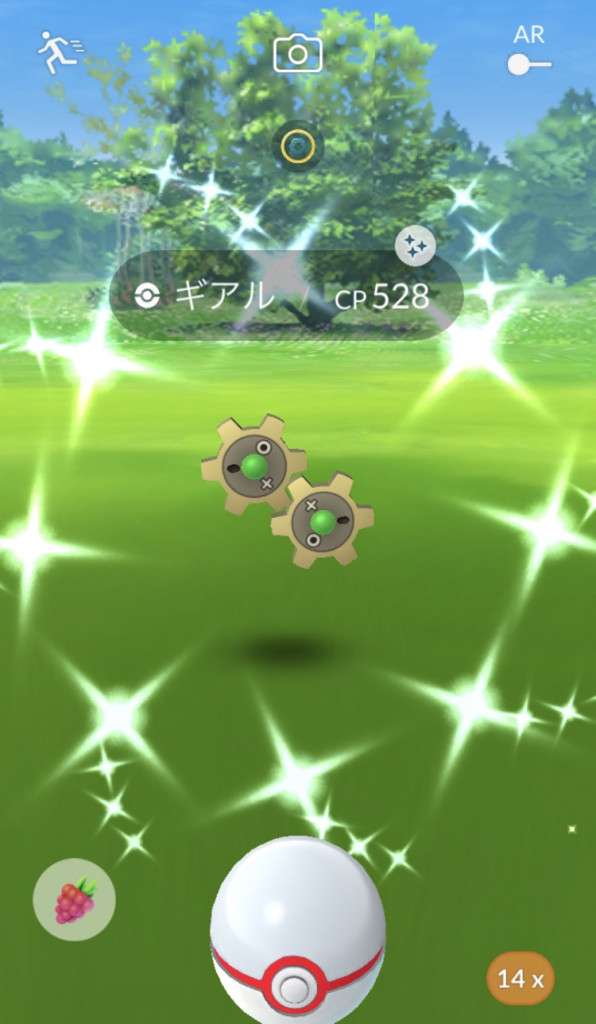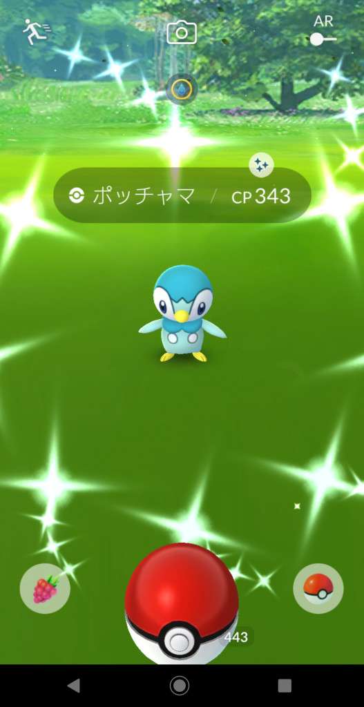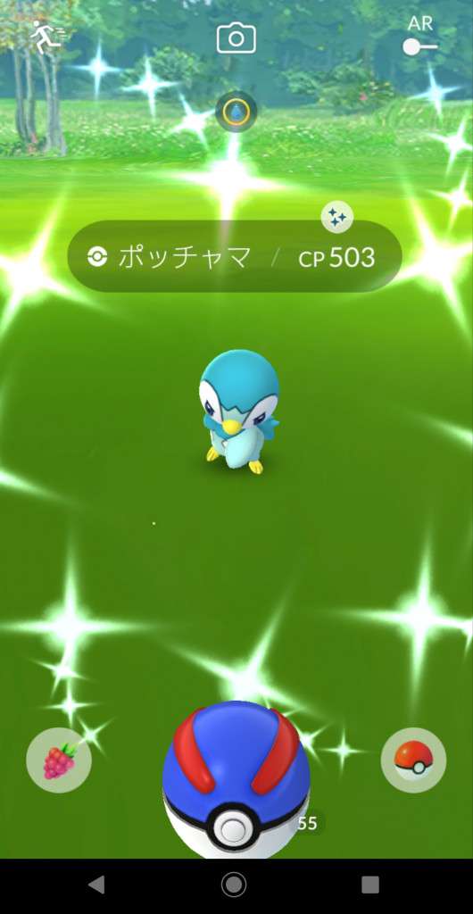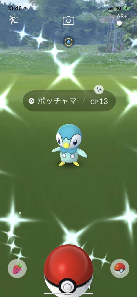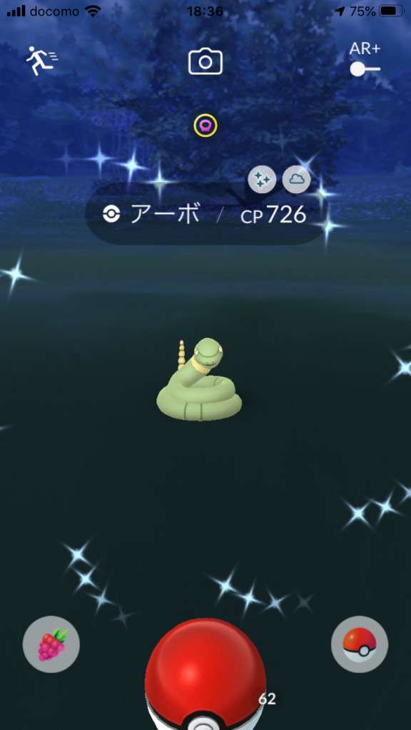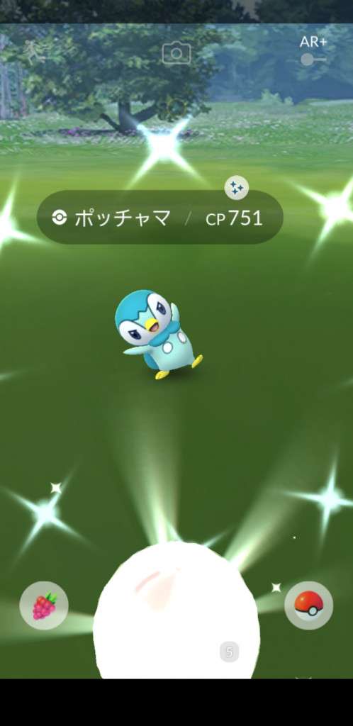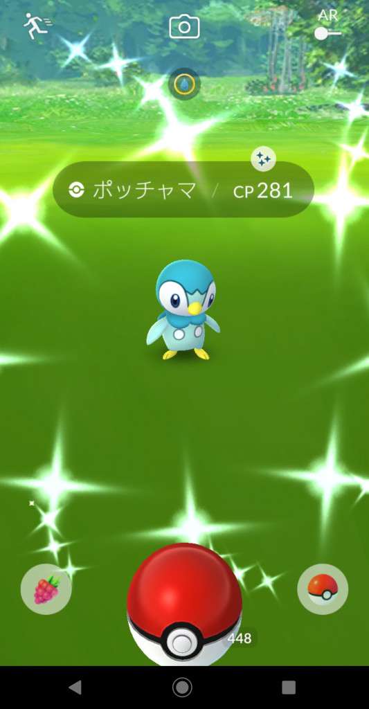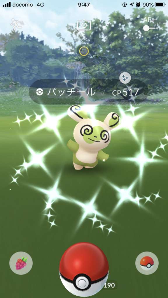 ・色違い出現したら、右上「AR+」のON・OFF切り替えで、タイミング良く写るまで何回も挑戦
