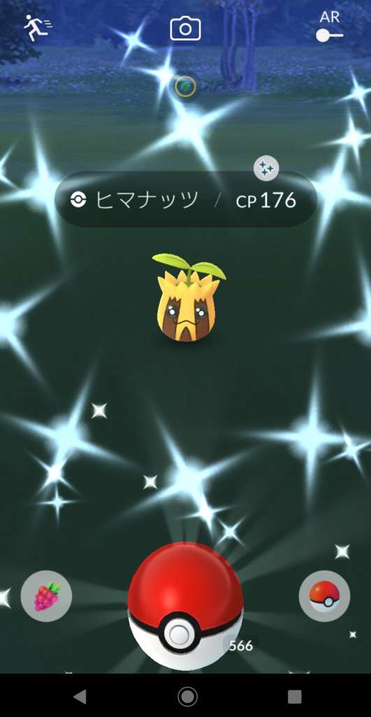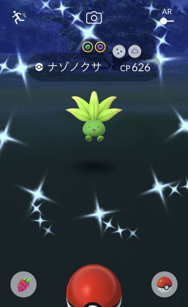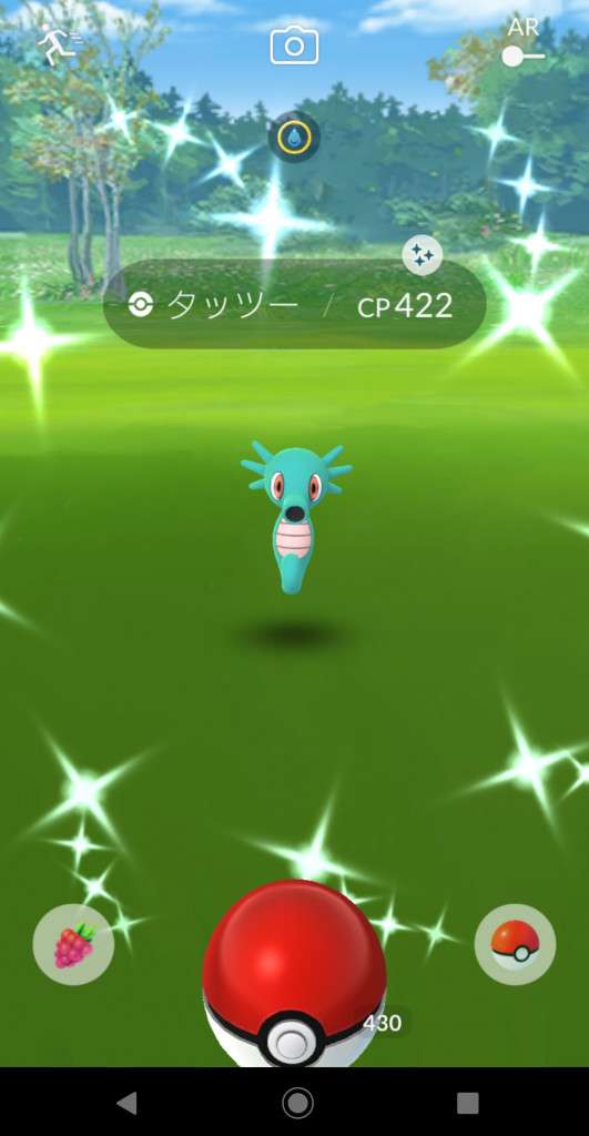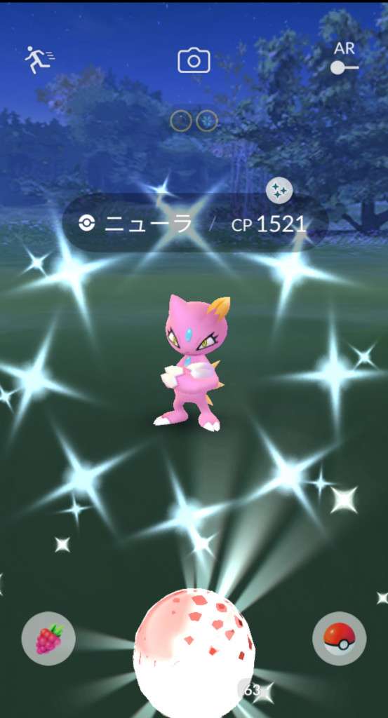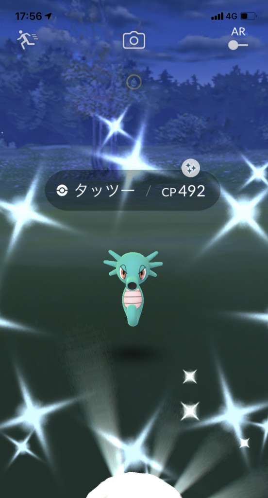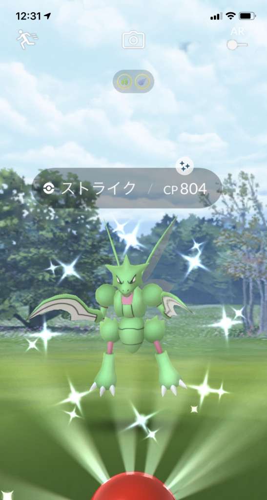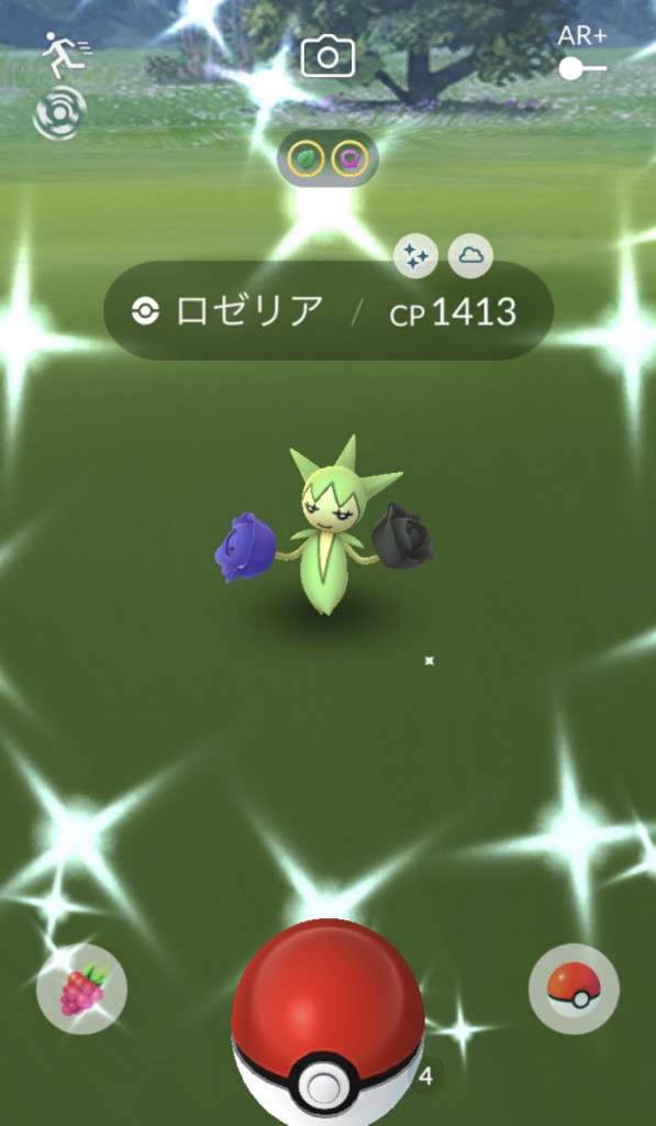 ・色違い出現したら、右上「AR+」のON・OFF切り替えで、タイミング良く写るまで何回も挑戦