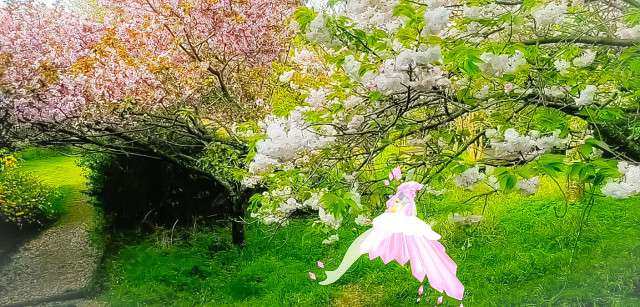①ふりふりの白いレースと、きらきらのピンクの水晶。