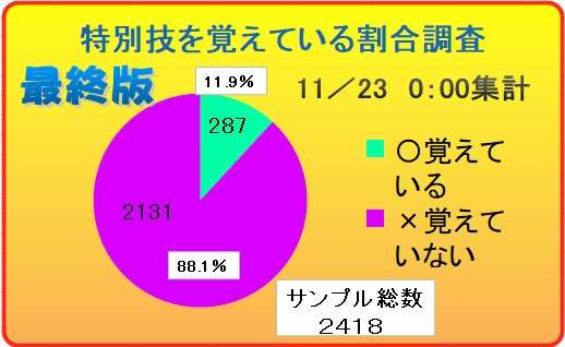 「ディアルガ、パルキアが特別技を覚えていた割合」を集計したいと思いますので、母数が10回(両方合算可)を超えた方は、レスをお願い出来ませんでしょうか。
