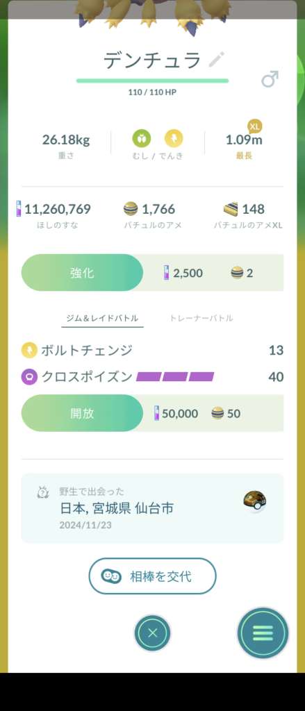18:00~18:15にゲットしたデンチュラ、なんで個体値こうなんだ?つよいポケモンは個体値13以上確定だよね?