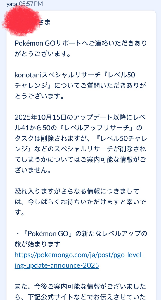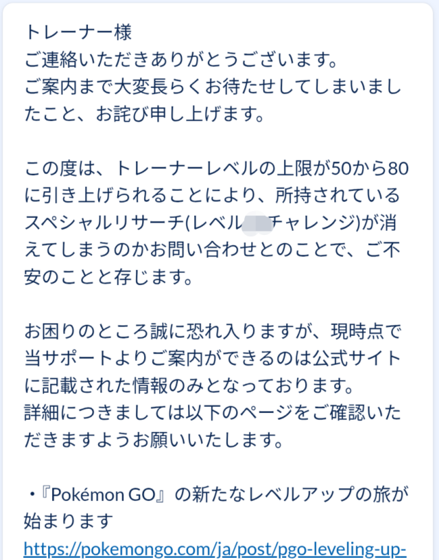 以前、他所で調べてもレベルチャレンジは消えないと言われていた。公式は発表していないよね?個別の問い合わせの回答では消えると言ってきているのか。もっときちんと発表しないと、TL50になってスペリサだけは受け取り、後はのんびりやろうと思っているトレーナーが気の毒。