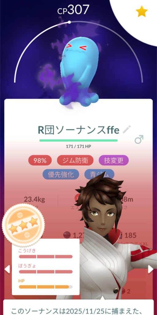 久しぶりにロケット団幹部から色違いで、しかも欲しかったソーナンス♂の色違いで喜んでたらとんでもない神個体値でした😭