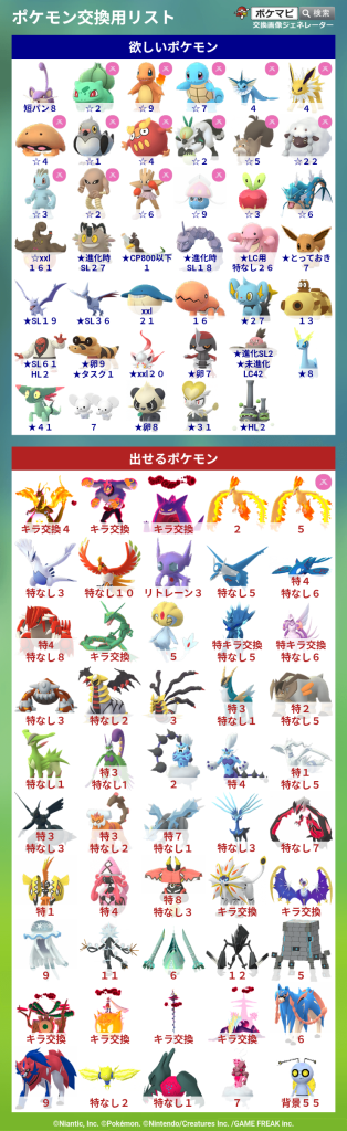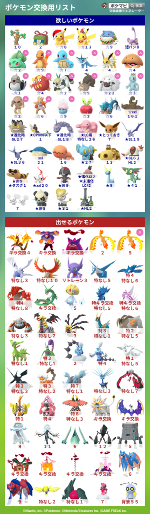 上記のポケモンをお出しいただける場合は、リストの☆ポケモンとコフキムシ(みやび)30の中からお好きなものを同数お出しします。
