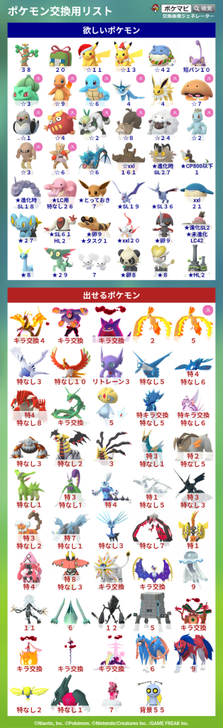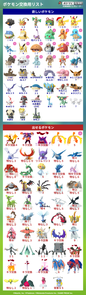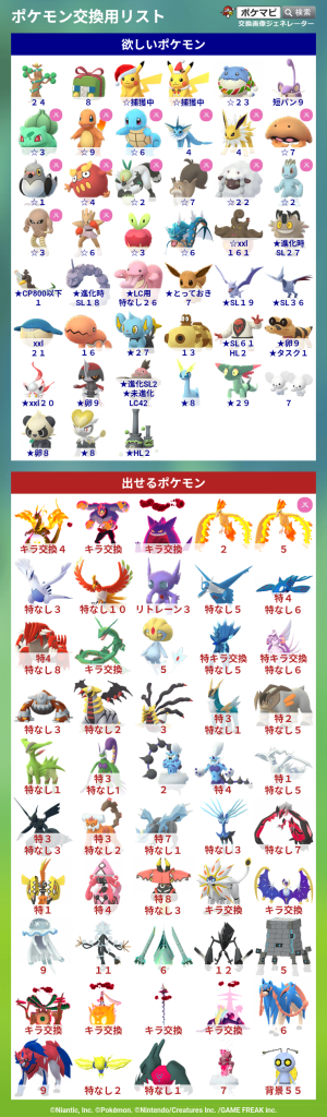 上記のポケモンをお出しいただける場合は、リストの☆ポケモンとコフキムシ(みやび)30の中からお好きなものを同数お出しします。