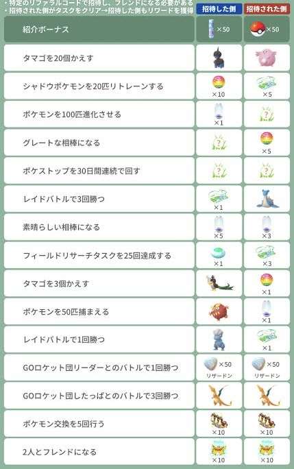フレンドにリファラルコードというコードをシェアして、一定の目標を達成すると、紹介したトレーナー自身と一緒に、特別なポケモンやふしぎなアメ、ふかそうちといった特別なリワードを受け取ることができます。