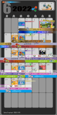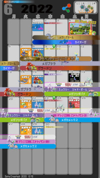 6/01(水) ▶![]() ![]() ![]() カイオーガ 01(水) | ![]() ![]() ![]() メガハガネール | 6/07(火) ▶![]() ![]() ![]() グラードン 08(水) 15(水) | ![]() ![]() ![]() メガプテラ |