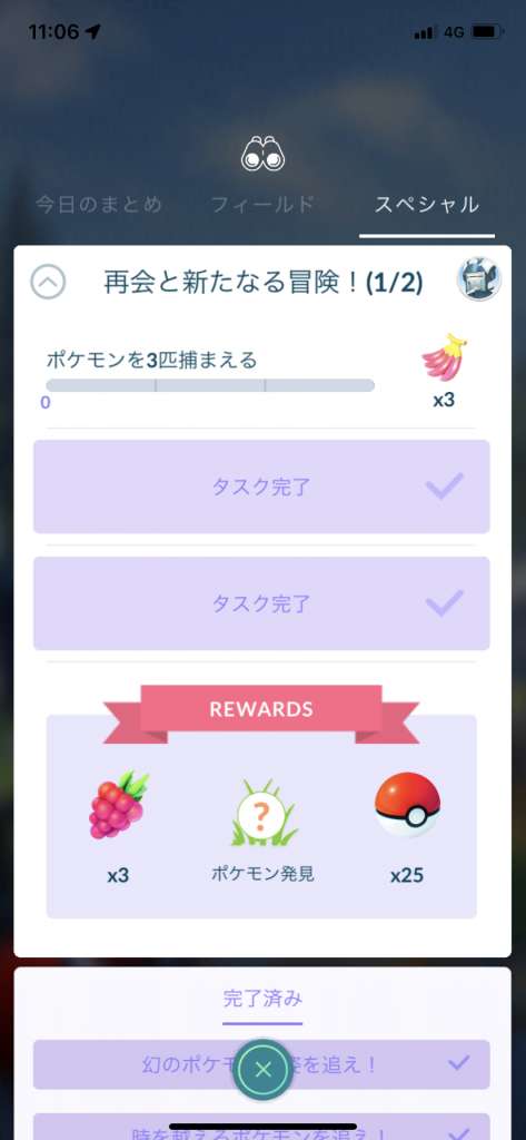 スペシャルリサーチ1/2の一番上が「ポケモンを3匹捕まえる」と表示されるバグが発生中。いくら捕まえても進捗しない笑