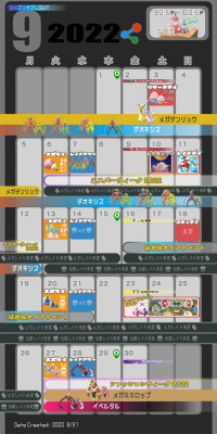 9/13(火) ▶![]() カミツルギ 北半球限定 14(水) 21(水) | ![]() テッカグヤ 南半球限定 14(水) 21(水) | 10/8(土) ▶9/27(火) ▶![]() ![]() ![]() イベルタル 28(水) | |