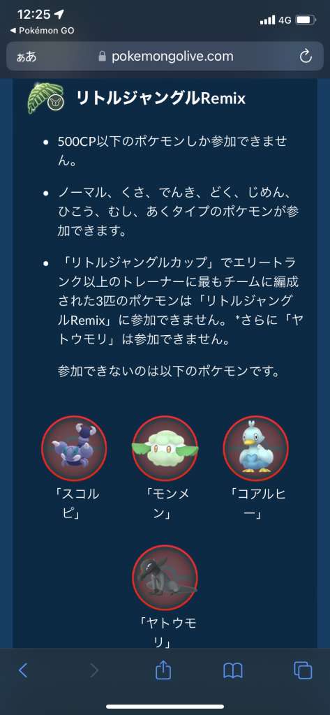 「リトルジャングルリミックス (CP500以下)」で参加不可なのは、チョンチーではなくスコルピ。