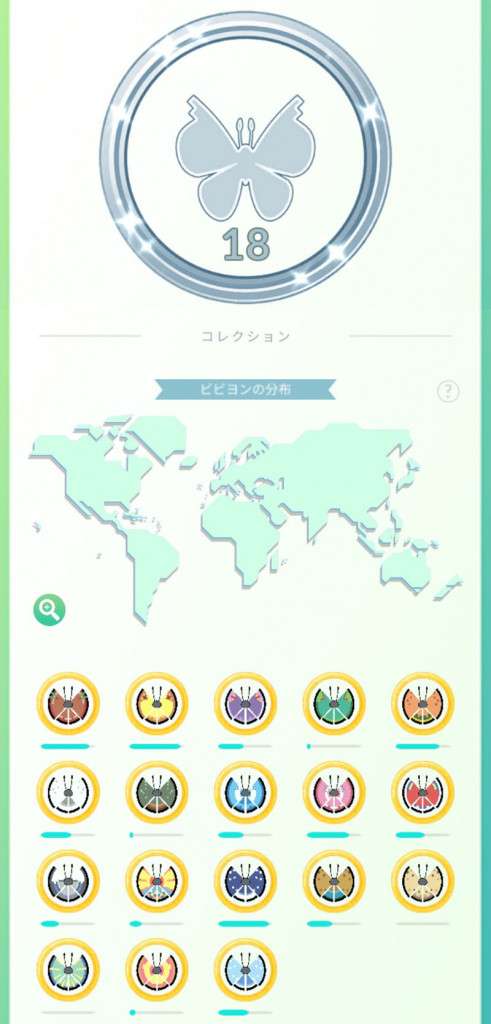 ビビヨンは様々な模様のあるポケモンで、ポケモンGOでは18種類が存在します。すべての模様を集めるには各国(各地域)のギフトをピン留めしていく必要があります。