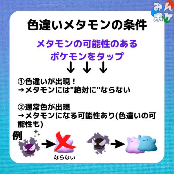 ポケモンGOでメタモンになる可能性のあるポケモンやメタモンの見分け方、色違いになる条件を紹介しています。