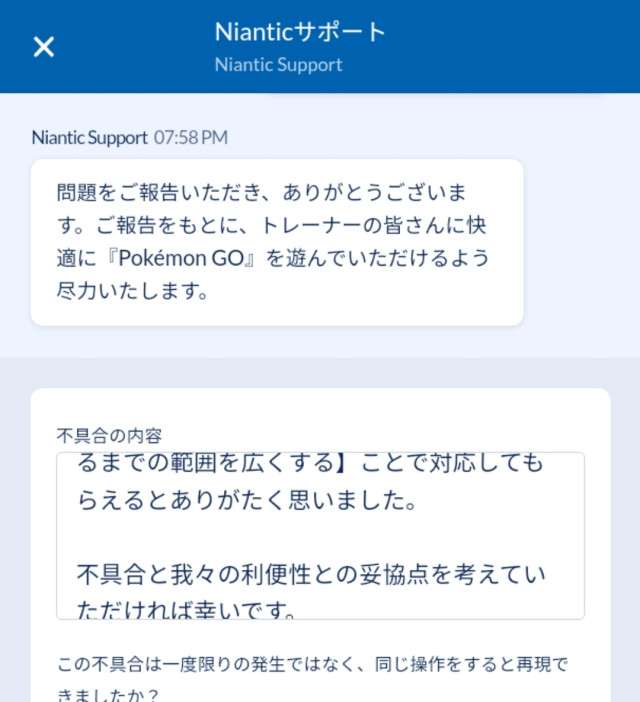 今まで思うことはすべてチャットで報告していましたが、本当に虚しくなってきた次第です。この掲示板に書かれているように不満に思うユーザーがいることも、正式な手続きで伝えないと伝わらないんだろうなと思い、このように提案した次第です。ナイアンは正直好きではありませんが「ポケモンGo」は好きなので、上手に運営してもらうためにも一皆さんの思いがチャットで届けばなぁ、と。そうすれば少なくとも「ユーザーの意見があった→ナイアンは知ってて対応しなかった」という事実は残せると思っています。