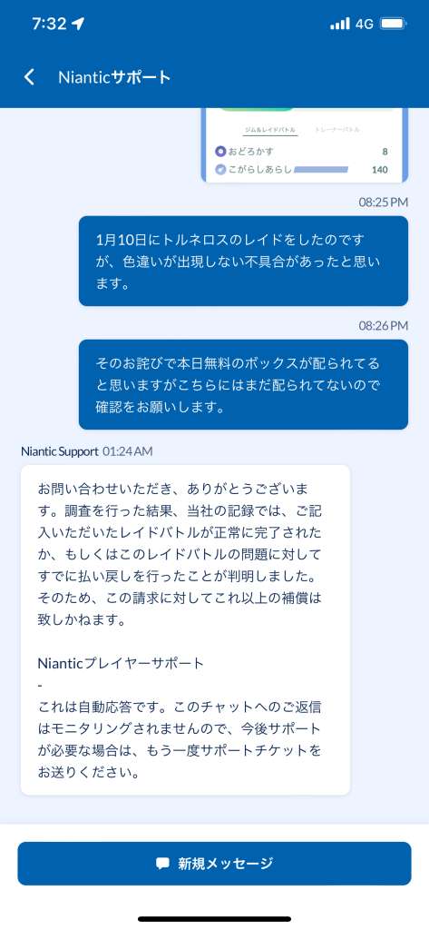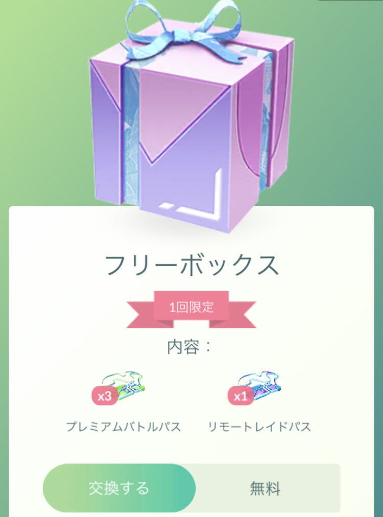 1月のトルネロスレイドで色違いが出なかった不具合の補填として、対象のトレーナーのショップに、レイドパス3枚、リモートレイドパス1枚入り無料ボックスが出ています。