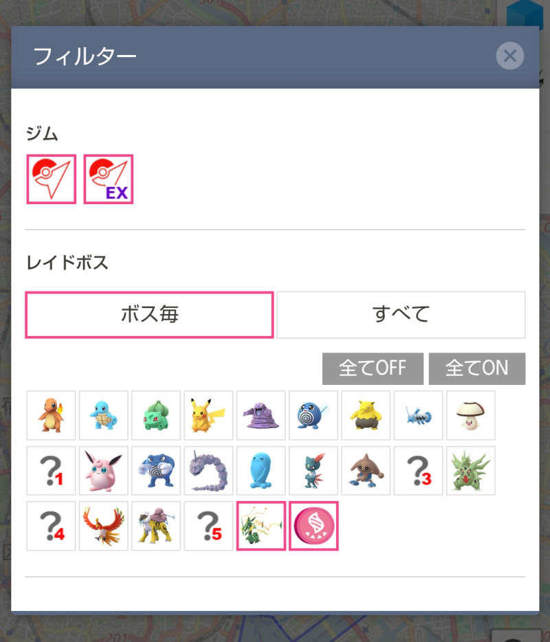 みんポケ共有マップではフィルターを画像のような設定にすることでエピックレイドだけを表示できます。