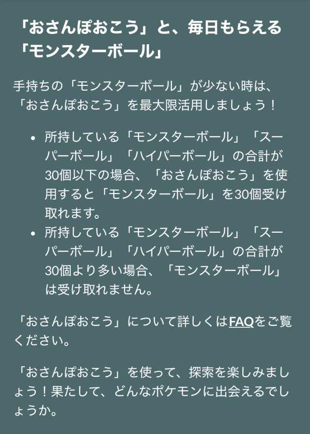 手持ちのボールが30個以下の場合,おさんぽおこう使用時,30個バックに補充されますよ!!
