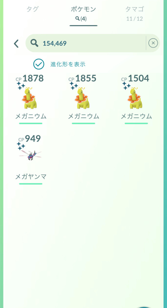 メガで検索するとメガシンカまたはゲンシカイキ可能なポケモン全てがヒットしますが、既にメガシンカしたことのあるポケモンを検索する場合はメガ1, メガ2, メガ3やメガ1-2などで検索すると良いようです。