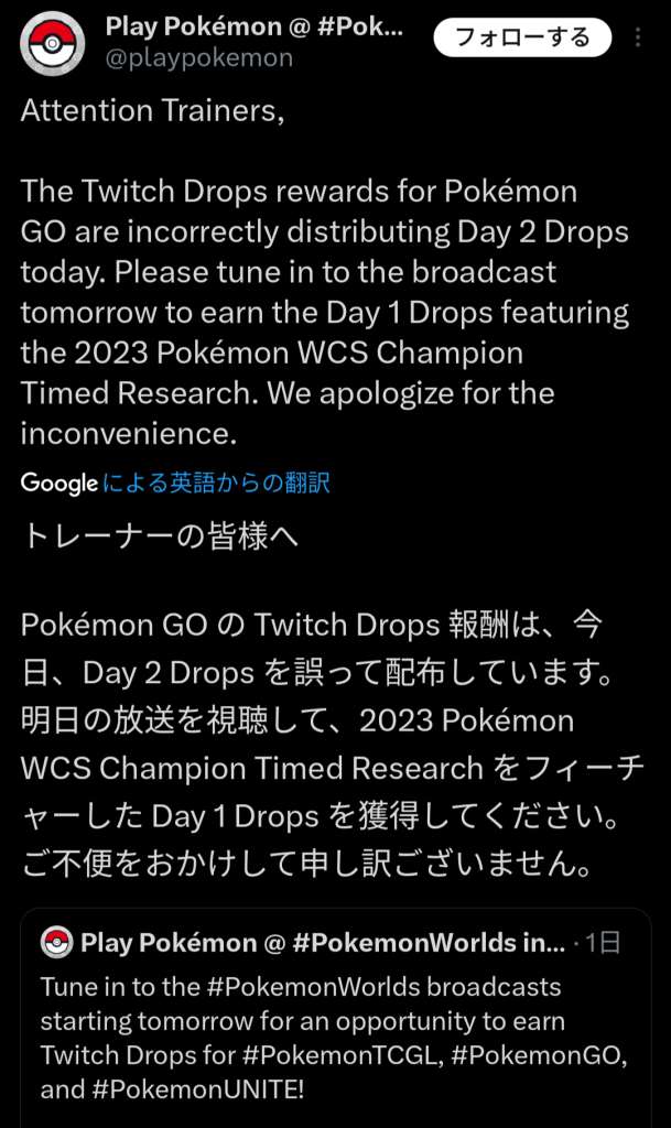 WCS2024Twitch Drops2日目 2023年のポケモンワールドチャンピオンボーナス 詳細