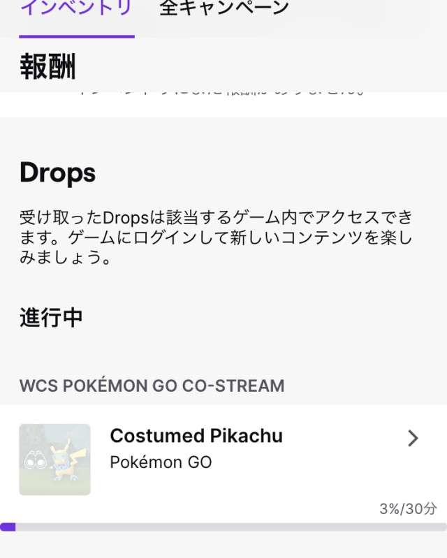 一部公式ストリーマーではないユーザーもヒットするため、配信のタイトルを見て「co-stremer」「drops」などのワードが入っていることを確認し、また、視聴中にインベントリページにて視聴時間が進んでいるかも確認しておきましょう。