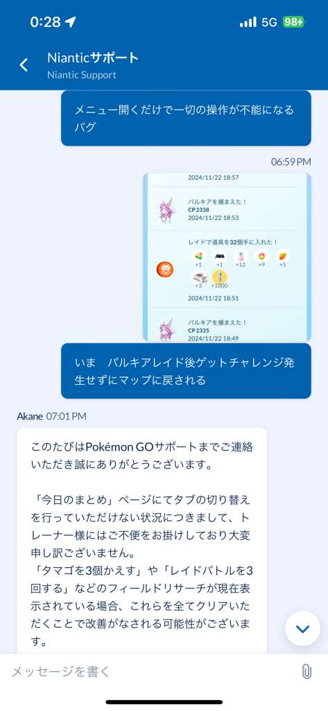 操作不能になるバグを報告したら「フィールドリサーチをクリアすると直るよ!」とか言い出した。操作できねーって言ってんだろカス