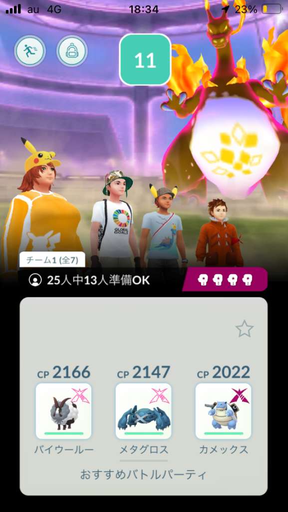 キョダイマックスカメックスを14人でチャレンジしましたが無理でした。キョダイマックスリザードンを13人で倒しました。5回位再チャレンジして何とかでした。フシギバナは同じメンバーでは倒せず諦めていたら5人増えて18人で倒せました。