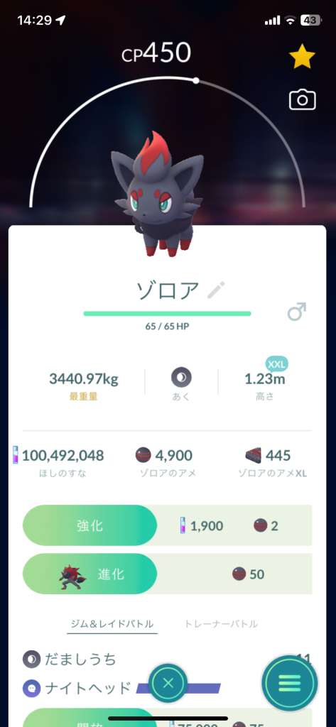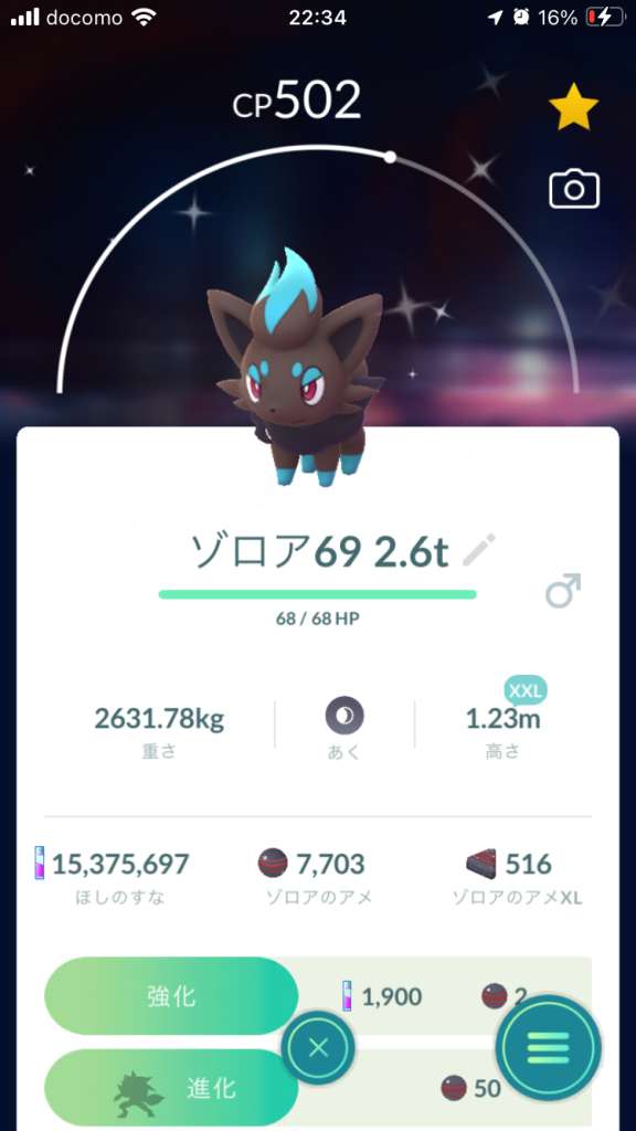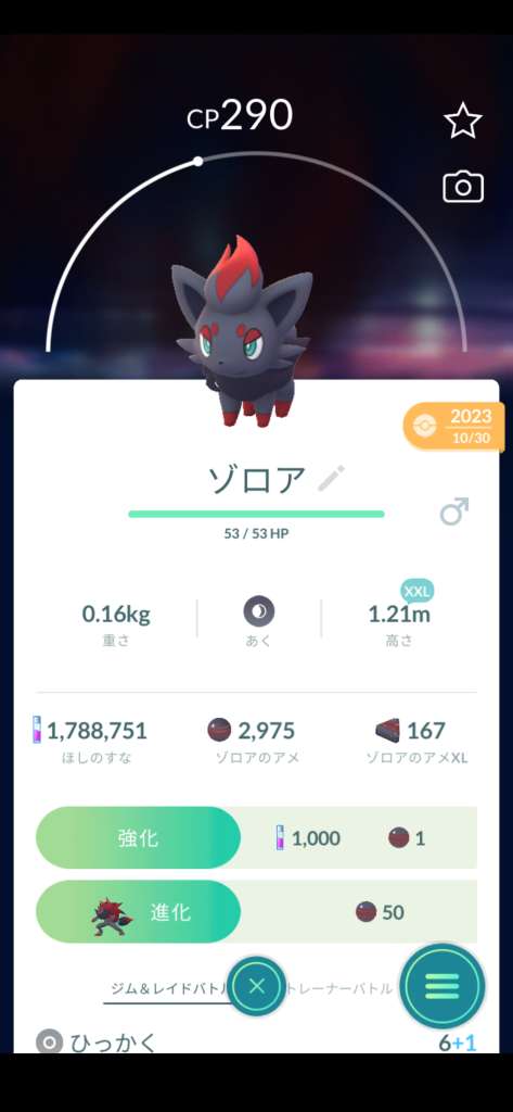 ゾロアークに関しては何体も比較できていませんが、通常の進化と同じく、進化後は重くなる方向のようです。