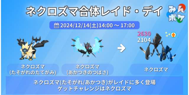 「ネクロズマ(たそがれのたてがみ)」「ネクロズマ(あかつきのつばさ)」が、普段より多くレイドバトルに登場します。※