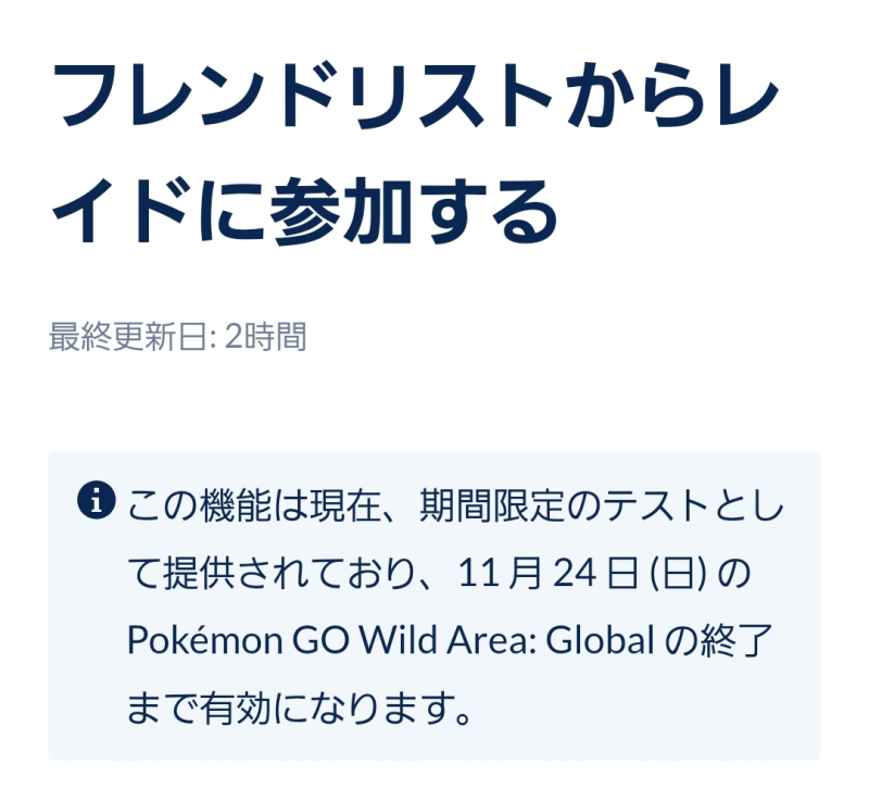 公式のヘルプによると、フレンドリストからレイドに参加できる機能は現在、期間限定のテストとして提供されており、11 月 24 日 (日) の ワイルドエリア:Global の終了まで有効とのことです。