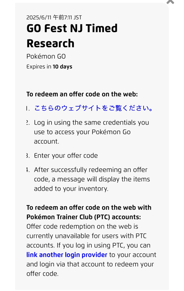 | 5 | ポケモンリワードページに表示されている手順に沿って、ポケモントレーナークラブ(PTC)アカウントとTwitchアカウントを連携させて「オファーコード」を入手する ※ポケモンGOとPTCアカウントを連携させる必要はありません |