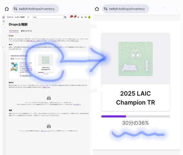 このリンク先のインベントリで、視聴時間の進み具合を確認できます。連携できていれば、進捗具合が見られるはず。