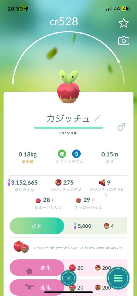 進化にはアメ200個とすっぱいりんごかあまーいりんごが20個必要