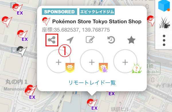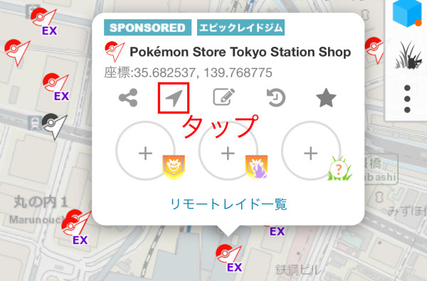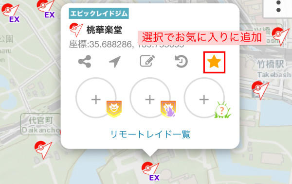 レイドが開催しているジムを選択し、吹き出しの右上にある「★マーク」を選択することで、そのジムをお気に入り登録することができます。