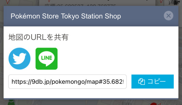 共有したい「スポット等のアイコン」をタップし、ふきだし内の「みんポケマークアイコン」をタップすると、該当位置を示すURLを取得・共有することができます。