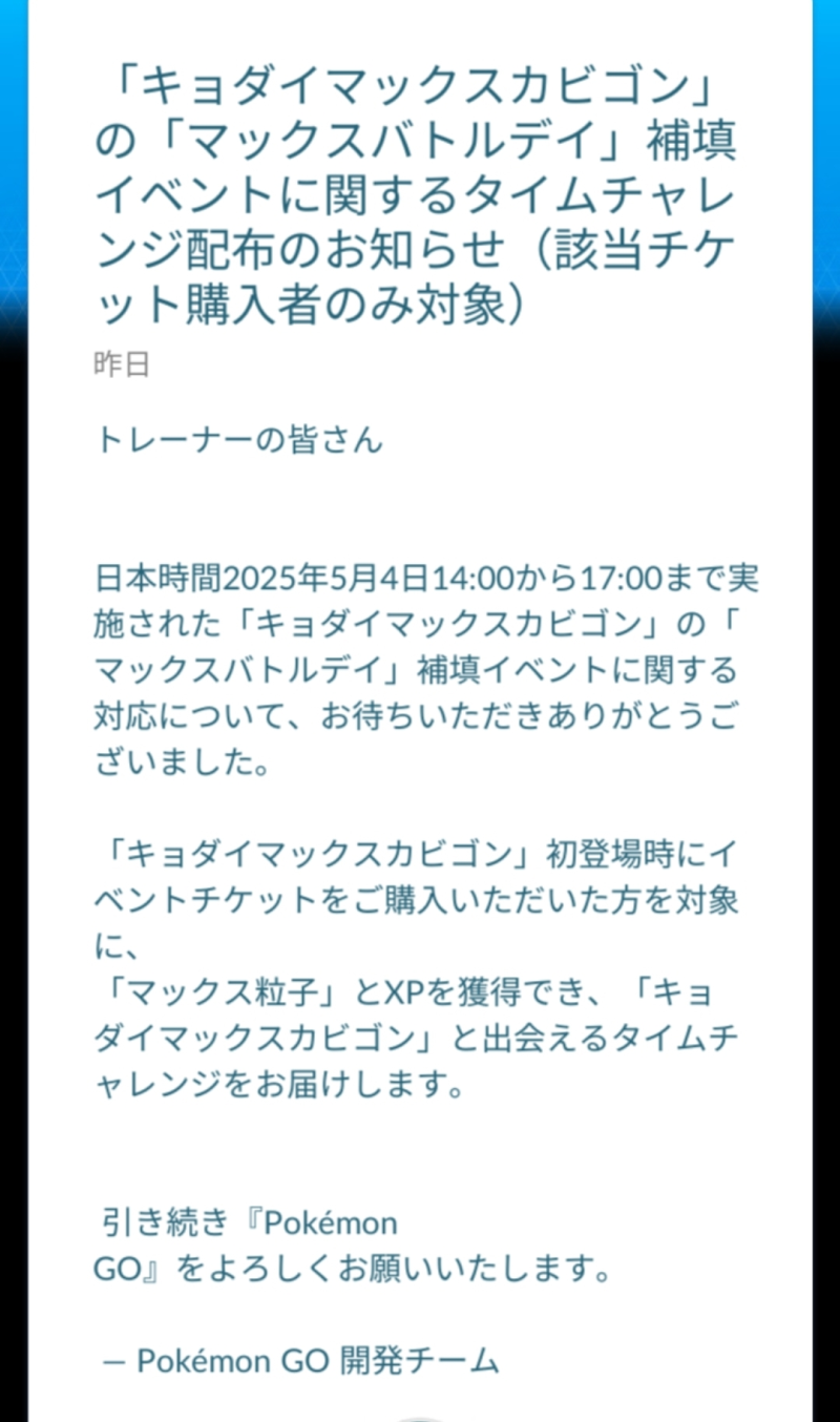 マックスバトルデイ:キョダイマックスカビゴン(補填)にて発生していた不具合について、公式から謝罪文と今後の対応についてゲーム内お知らせに投稿されました。