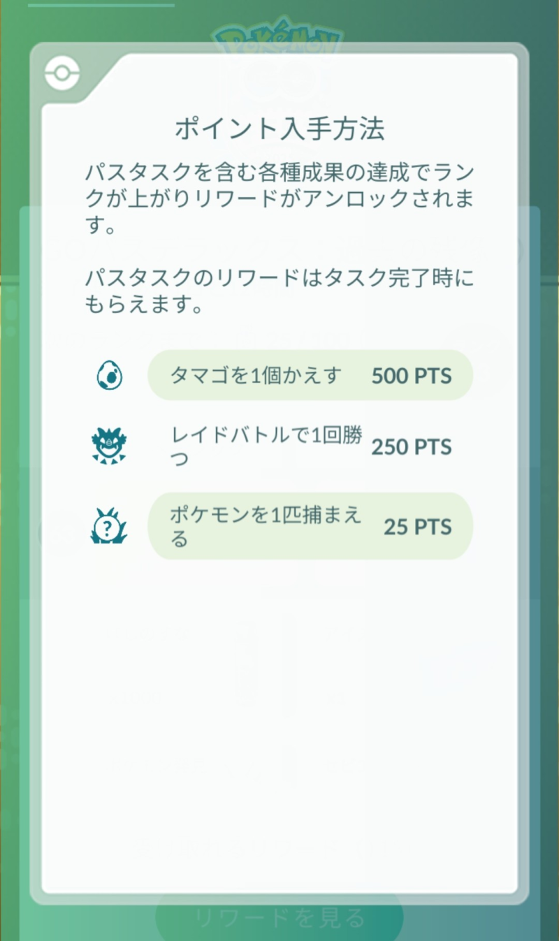 6/28 AM0時から獲得ポイントの内訳が以下のように変更になりました✅タマゴを1個かえす250▶500✅レイドバトルで一回勝つ100▶250✅ポケモンを1匹捕まえる5▶25GOパス:過去の残像