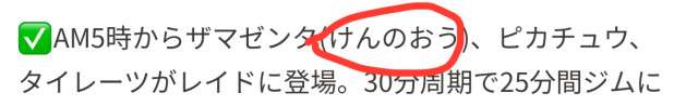 ✅AM5時からザマゼンタ(たてのおう)、ピカチュウ、タイレーツがレイドに登場。30分周期で25分間ジムに出現する