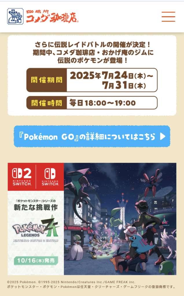 また、7月24日(木)〜31日(木)まで、毎日18時からコメダ珈琲店・おかげ庵のジムで伝説レイドが開催予定です。