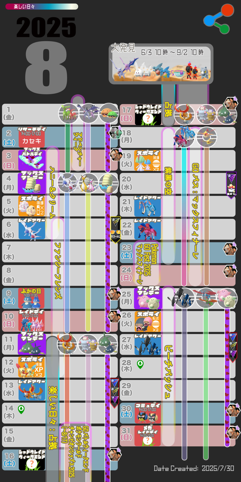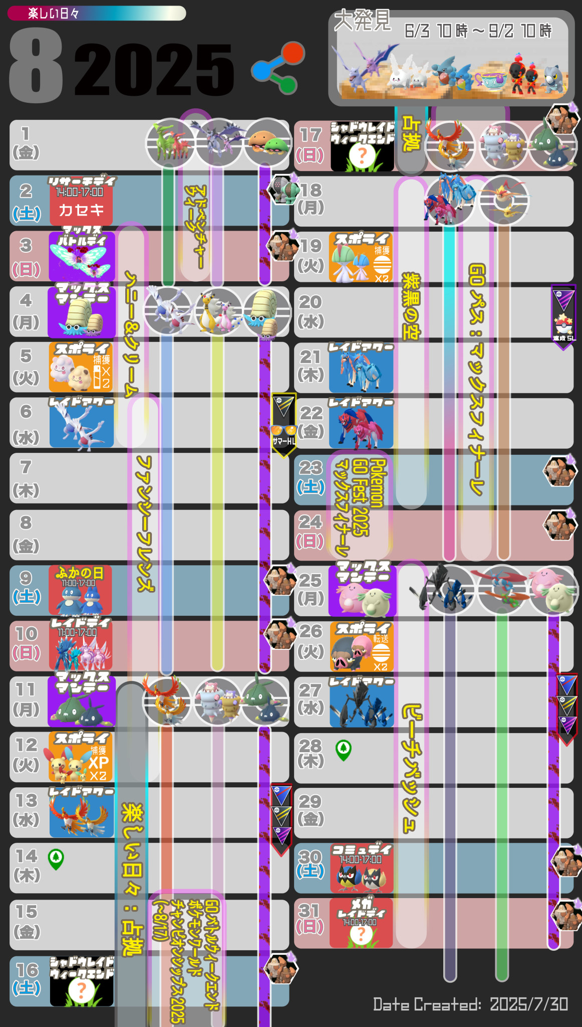 2025年8月のポケモンGOのイベント情報を掲載しています。大発見はシーズンページに移動しました。