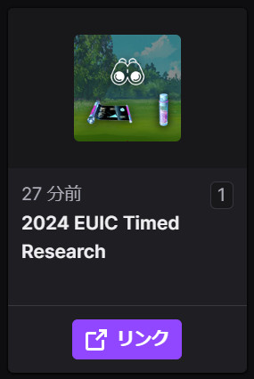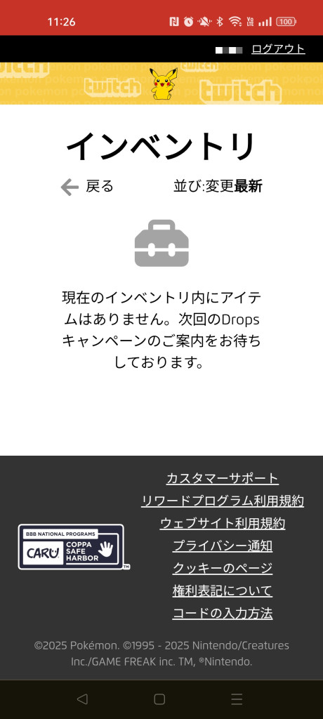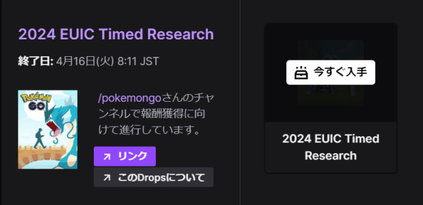 | 4 | Twitch Dropsのインベントリを開き「今すぐ入手」ボタンを押す。![]() さらに「リンク」ボタンを押してポケモンリワードページを開く。 ![]() リンクが表示されない場合でも直接ポケモンリワードページを開くことで以降に進めます。 ※画像は以前開催されたEUICの情報を掲載 |