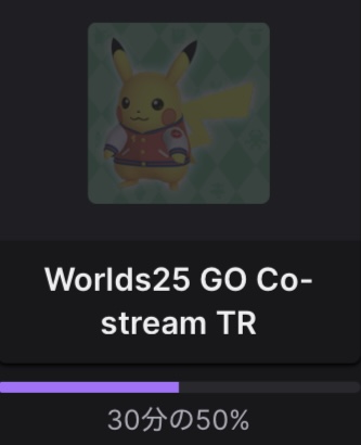 さらに、「ポケモンワールドチャンピオンシップス」の『Pokémon GO』部門を配信する『Pokémon GO』のTwitch公式コラボ配信(Stream ogether)を30分間視聴すると、3個目の「タイムチャレンジ」のコードを入手できます。