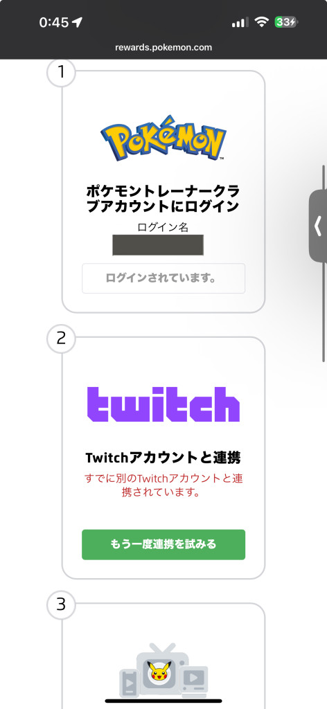 | 0 | 事前準備 ・Twitchアカウント ・ポケモントレーナークラブ(PTC)アカウント |